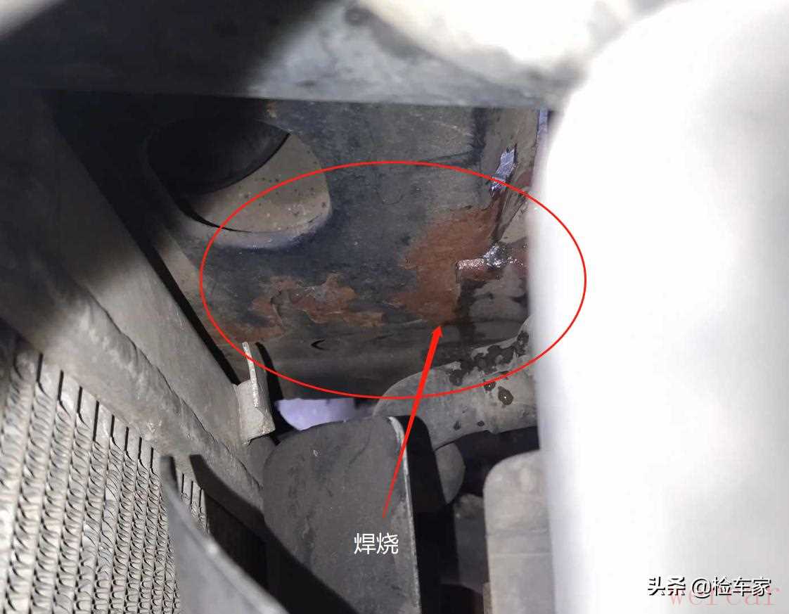 仔细一看,果不其然,右前的水箱框架有变形修复的痕迹,因为这款的奔驰有一部分的水箱框架是和纵梁是一体的,无法拆卸分解,所以只能烧焊修复。所以基于二手车鉴定评估技术标准GB/T30323-2013,这辆车可以评定为事故车。