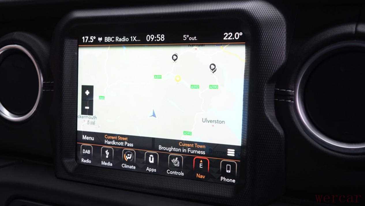 Jeep为牧马人提供了一个8.4英寸的触摸屏以作为标准配置,包括卫星导航,以及苹果CarPlay和Android Auto,后者的系统反应灵敏,使用起来也很直观;仪表盘中加入7.0英寸TFT屏幕,可以显示越野信息和卫星导航,此外,还加入了一套配有8个扬声器的阿尔派音响系统。