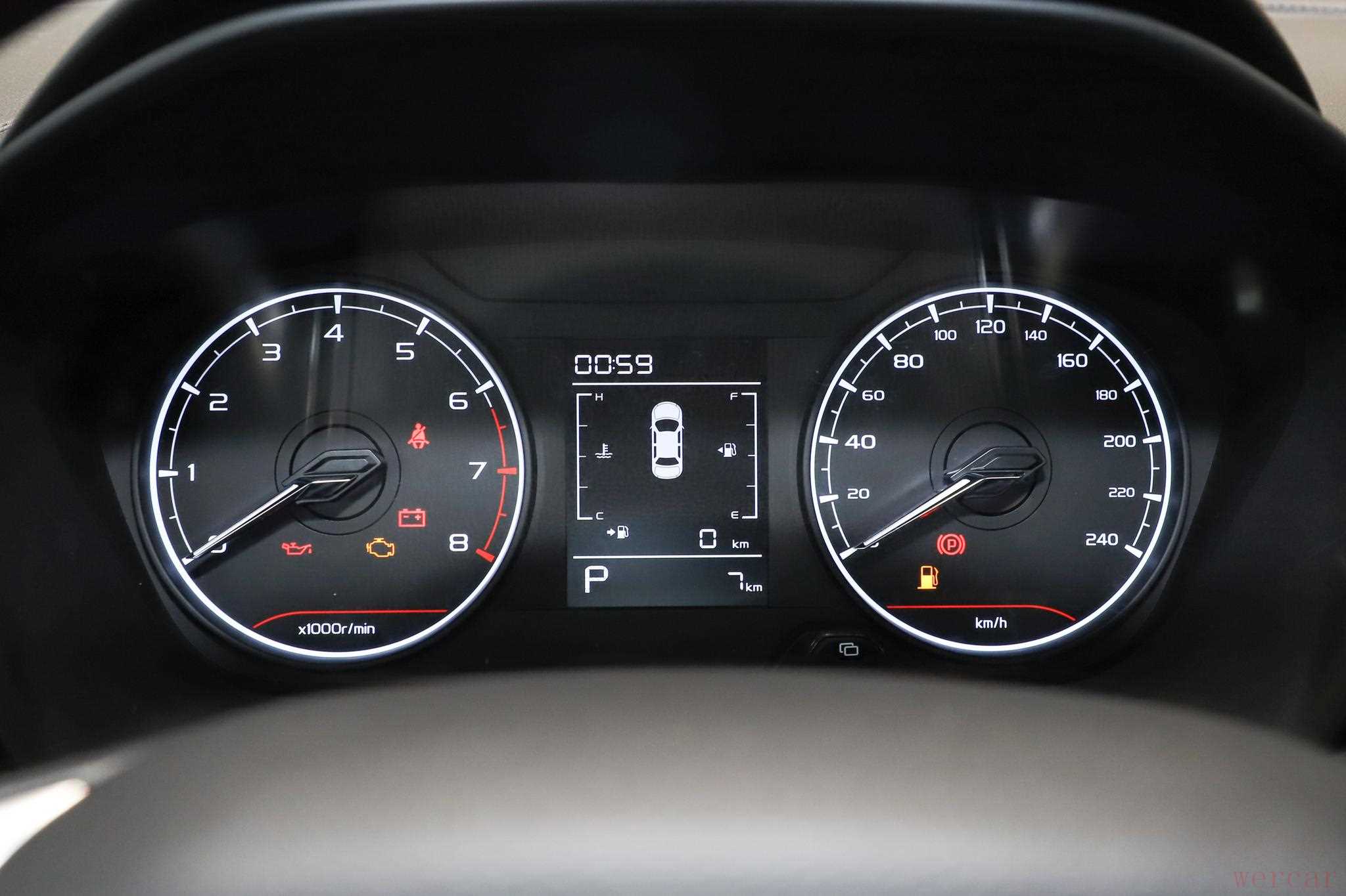 皮质运动方向盘,多功能按键控制,支持上下调节。半机械指针仪表,带小尺寸液晶屏,信息显示直观。