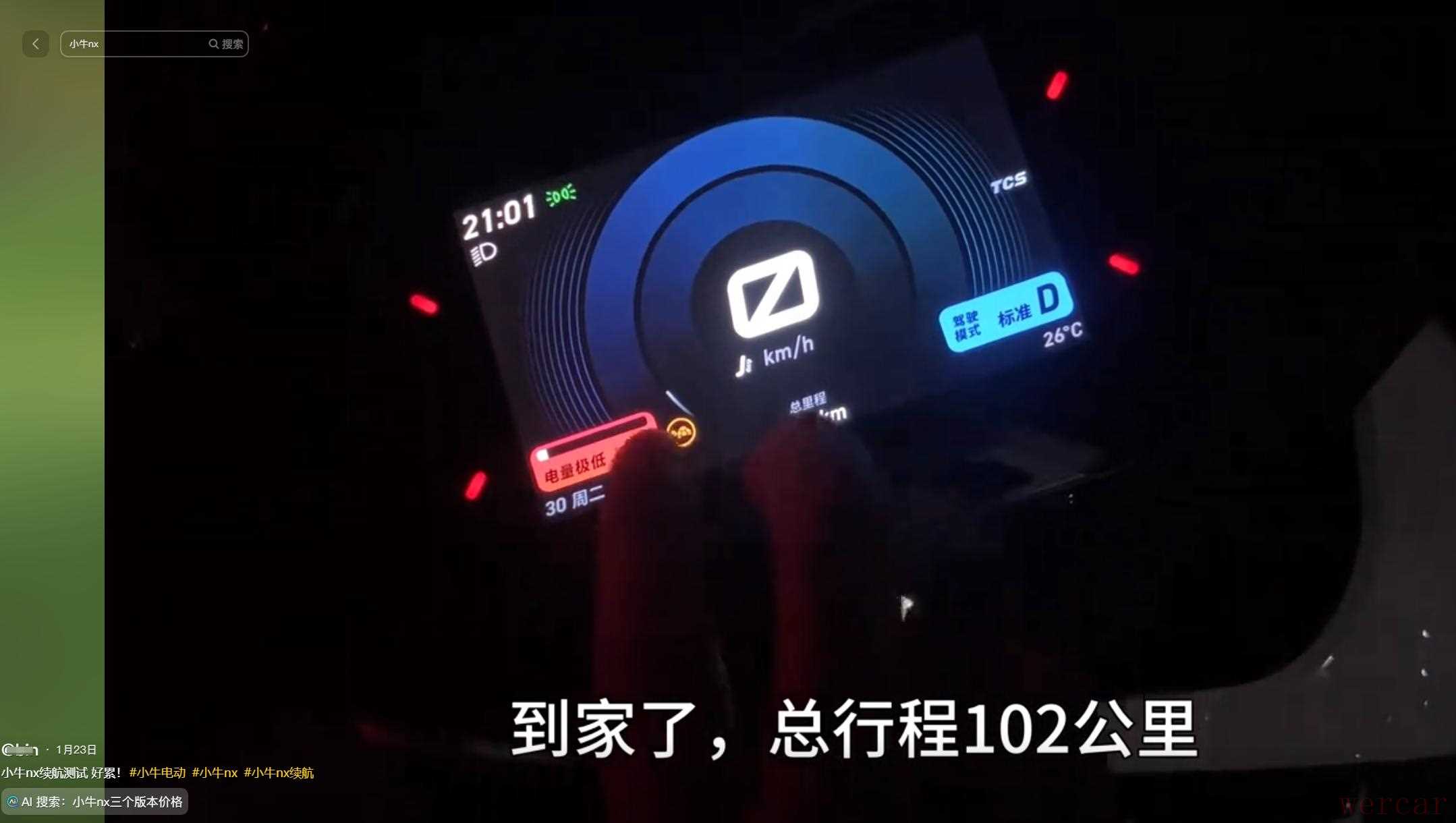 作为智能车代表品牌,电动车起步价都是3000元以上,而在实测续航超过100公里,小行家找到这款小牛NX,车辆表现续航达到102公里,且还剩余9%的电量。