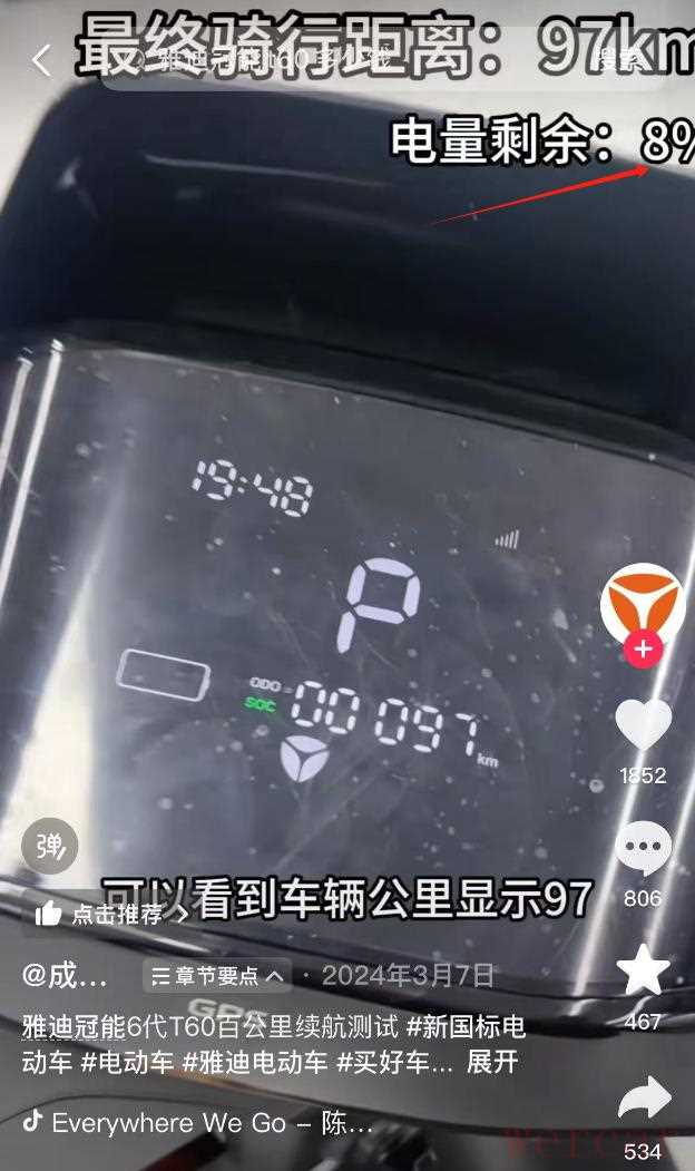 雅迪T60在实测中的表现,电量剩余8%,续航97公里,由此可见,在满电用完的情况下,该车是可以跑到100公里的。