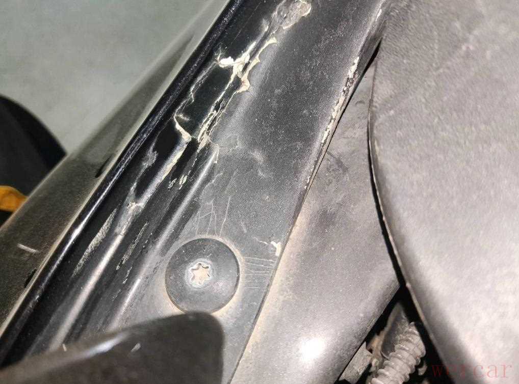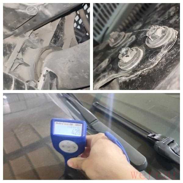 随后发现前面的水箱框架没有动过,机盖有拆卸的痕迹,测了一下机盖钣金喷漆,而且刮腻子的地方在风挡下边,估计是被什么东西砸了一下,不是前方的事故导致的。