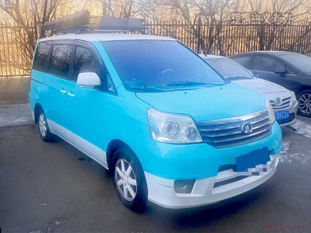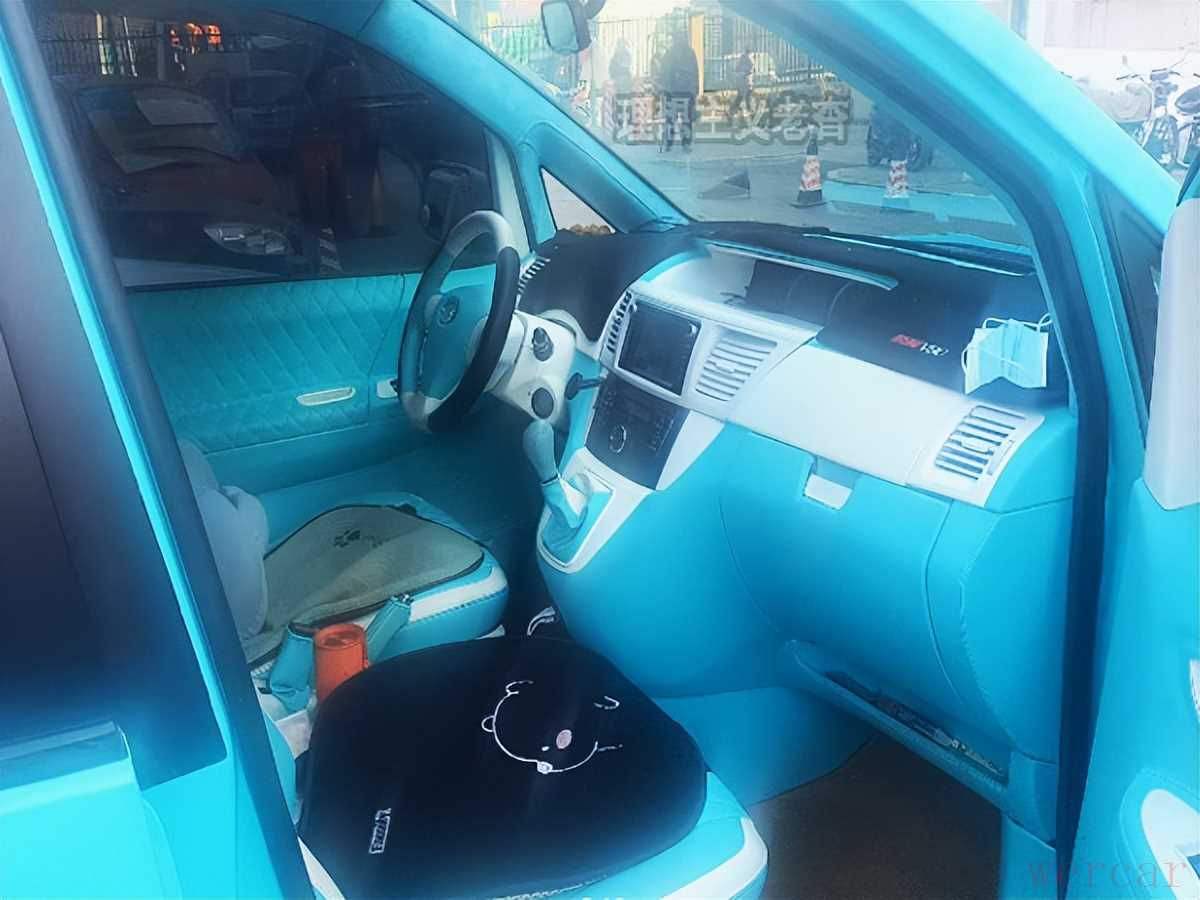 这是一台长城腾翼V80,汽油2.0L排量,手动5挡,5门7座,通身白蓝结合的车漆,象征蓝天白云,非常的清新靓丽,车顶加装了行李架,右上配备了侧边帐。