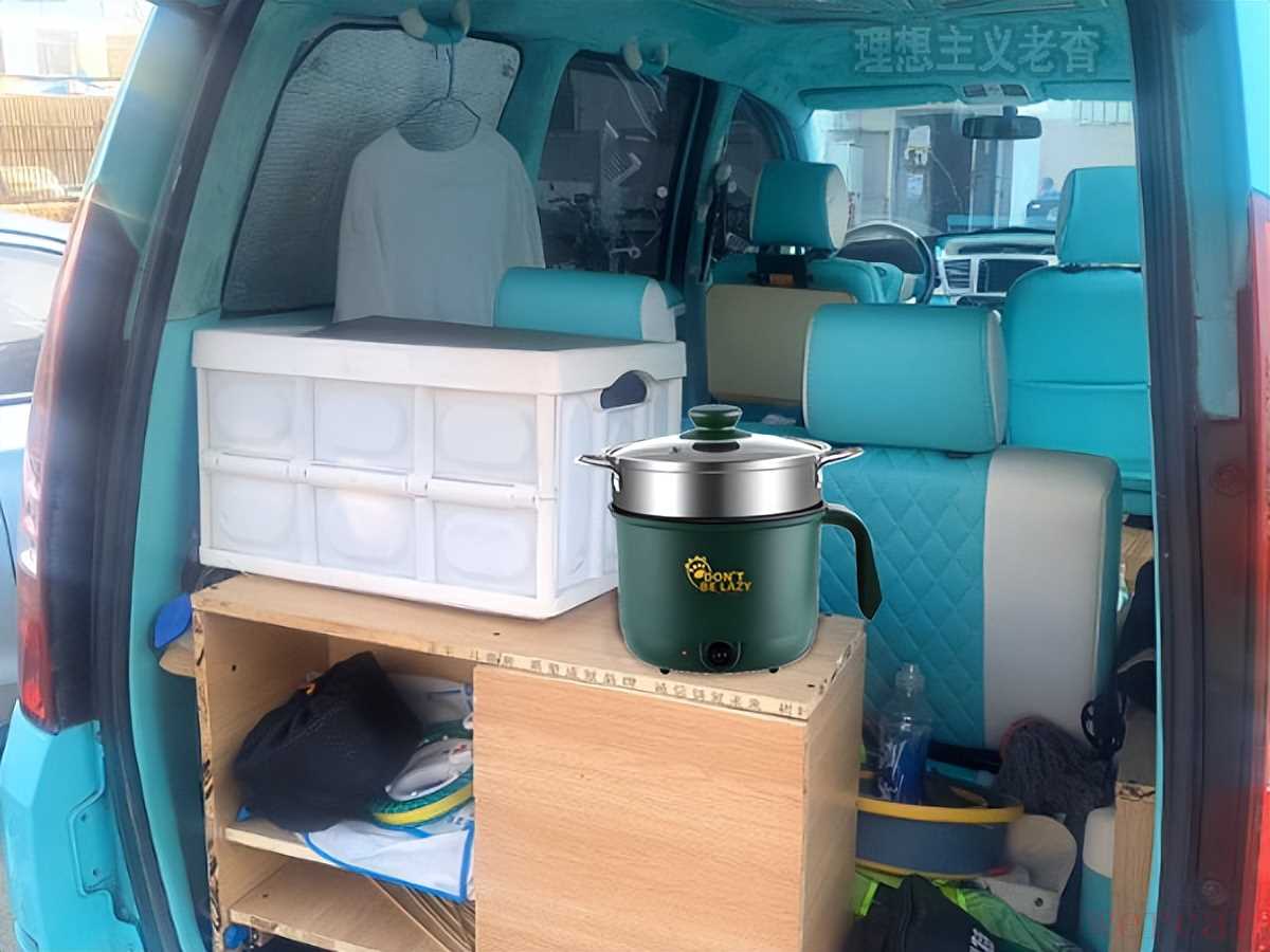 尾部是一张简易木柜,上面有收纳筐和电磁炉,可设计后置厨房,方便户外做饭。