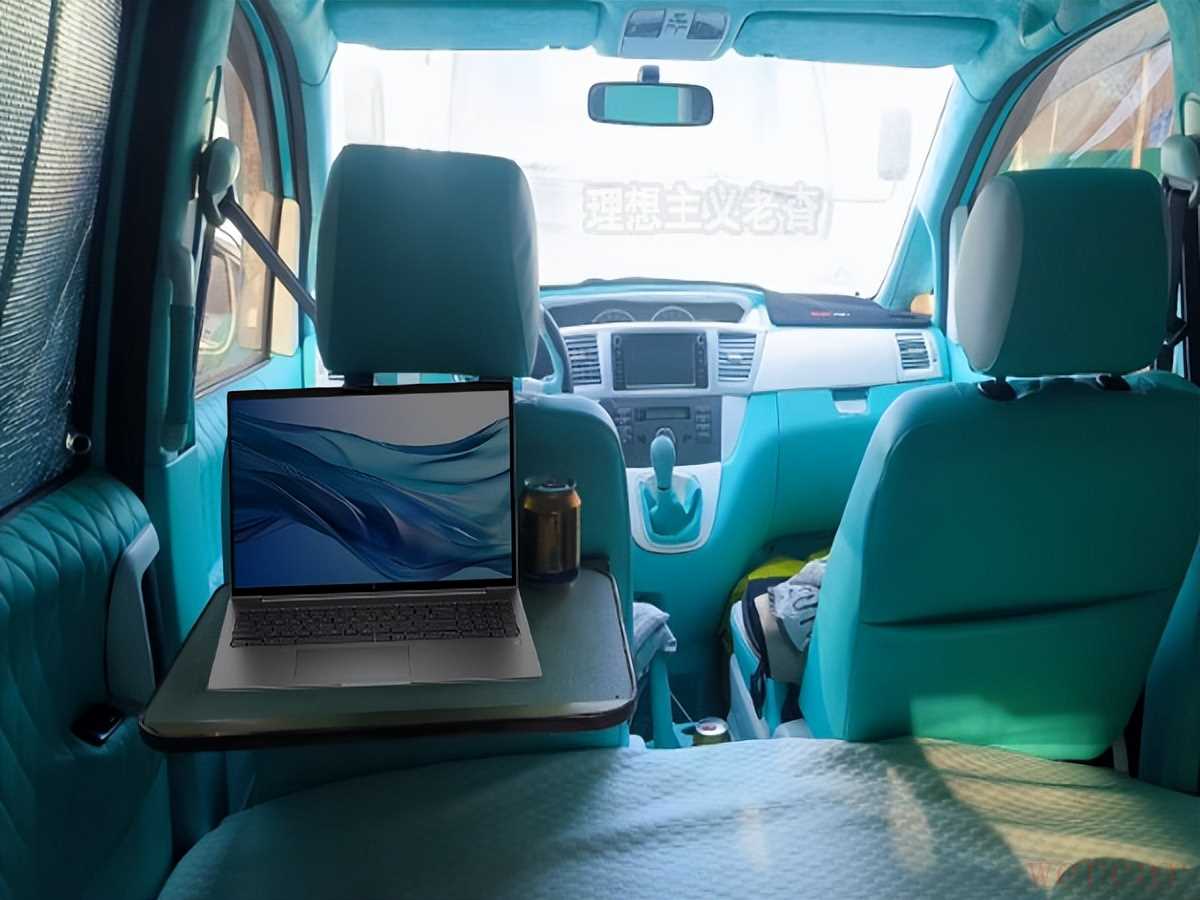 主驾座椅后面吊挂一张小桌板,放上了笔记本电脑和饮料,可谓车载迷你办公室。