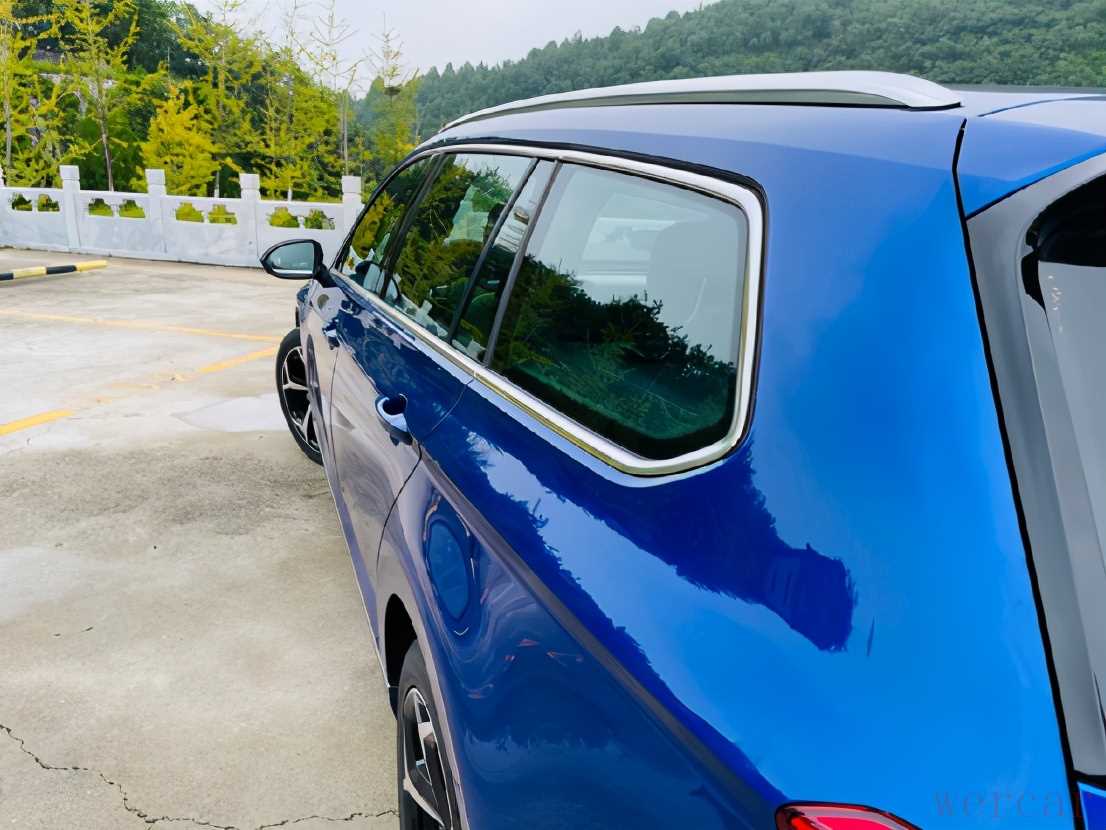 侧面造型永远是旅行车最迷人的部分,新蔚揽依旧保持了此前大众旅行车经典的硬朗造型,大尺寸的侧尾窗和竖直的D柱造型与时下流行的圆润设计风格完全不同,却让人百看不厌。从前翼子板R-line标识一直延伸到车尾的一条粗壮腰线是整个侧面的点睛之笔,配合粗壮的镀铬窗线和银色行李架,让整个新蔚揽的侧面线条即经典又耐看。
