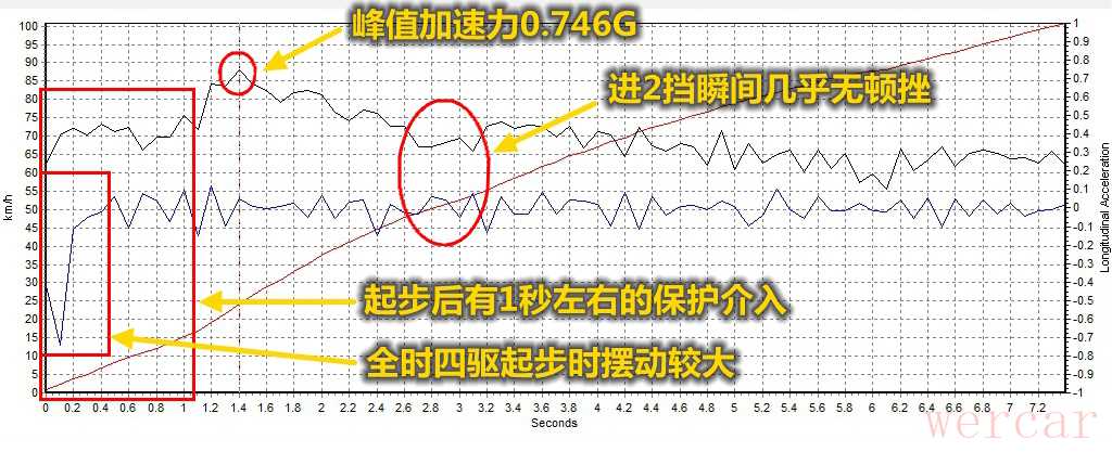 测试时温度大概25度,起步后大约有1秒左右介入保护,最终0-100km/h加速时间为7.3秒。