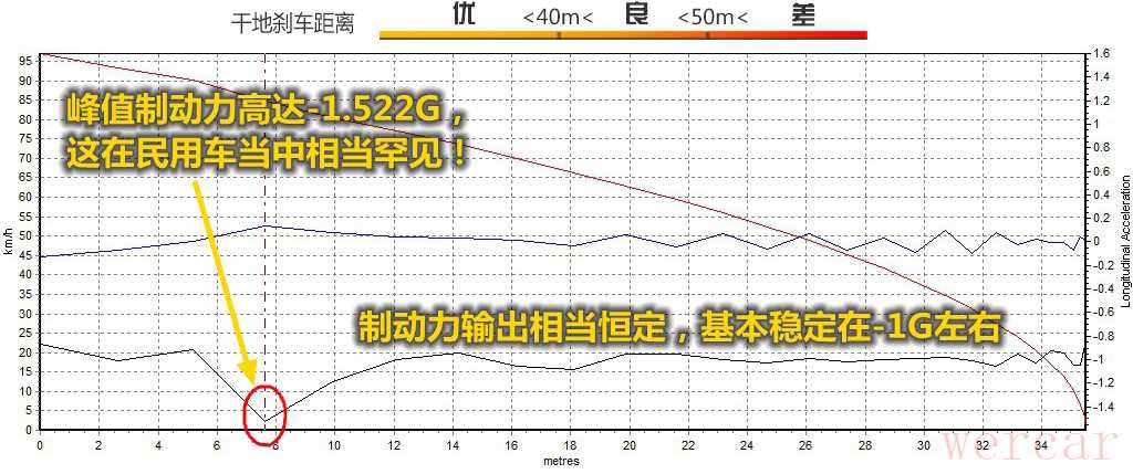 制动时,制动力基本维持在-1G,峰值制动力可达-1.522G,最终刹车距离为35.46米,还是一个不错的成绩。