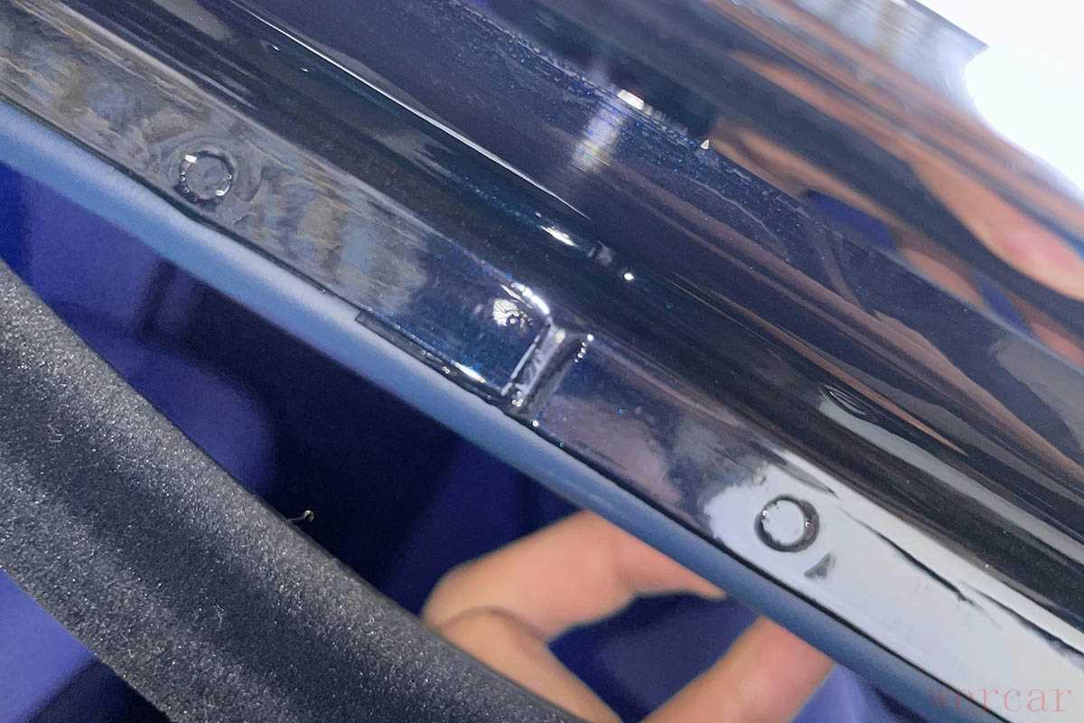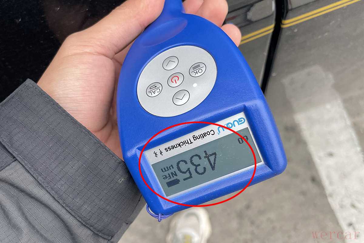 这种超级豪车一般都会贴车衣,所以漆膜仪点出的数值必然要比原漆高,经过检查发现全车除了大顶以外都存在后喷漆的痕迹,也就是相当于穿了个裙子。