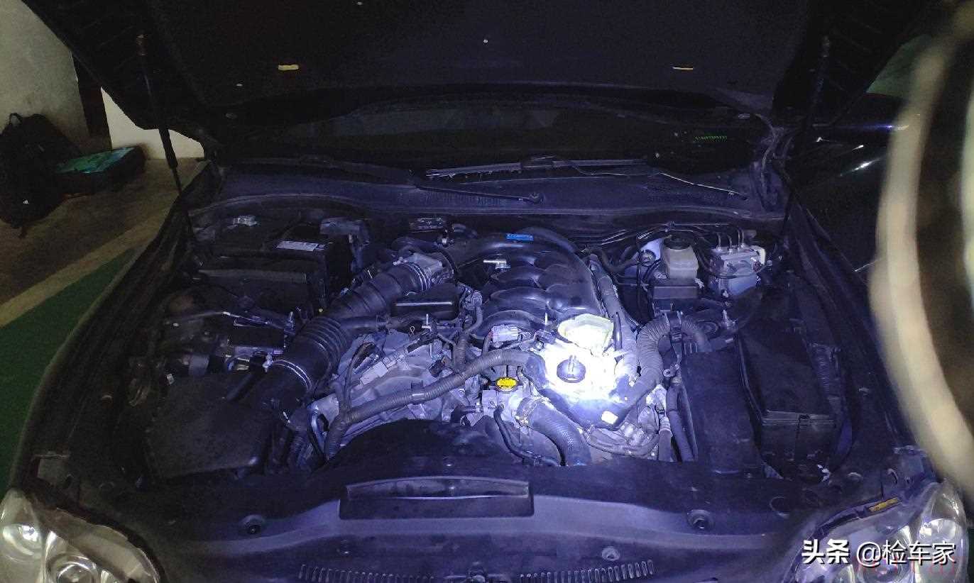 并且左前纵梁有着明显的凹凸感,这是属于钣金修复所产生遗留下来的,可以想象得到前面的碰撞力度有多大,前纵梁都受损了,那这辆丰田锐志又增加一个可以定义为国标事故车的地方。而且车头作为事故高发区域,这里比侧面和尾部更加重要!难怪卖家要说车况不太好了,实际情况比他说的要糟糕得多。先记下来吧,一会儿再具体告诉客户大哥,下面来看看发动机。