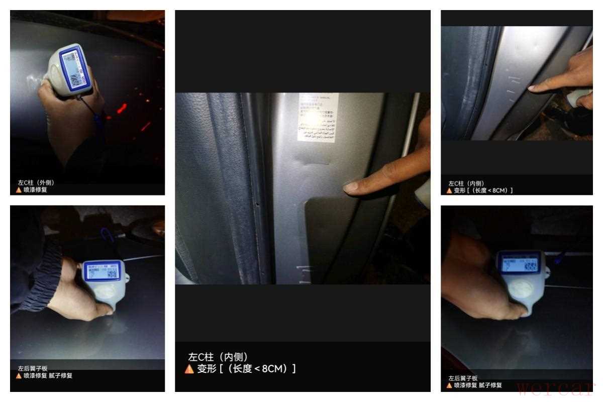 左后叶子板有钣金喷漆数值500左右,左C柱内侧还有轻微的变形和掉漆,左侧的情况相当不妙!咱们继续往下看。