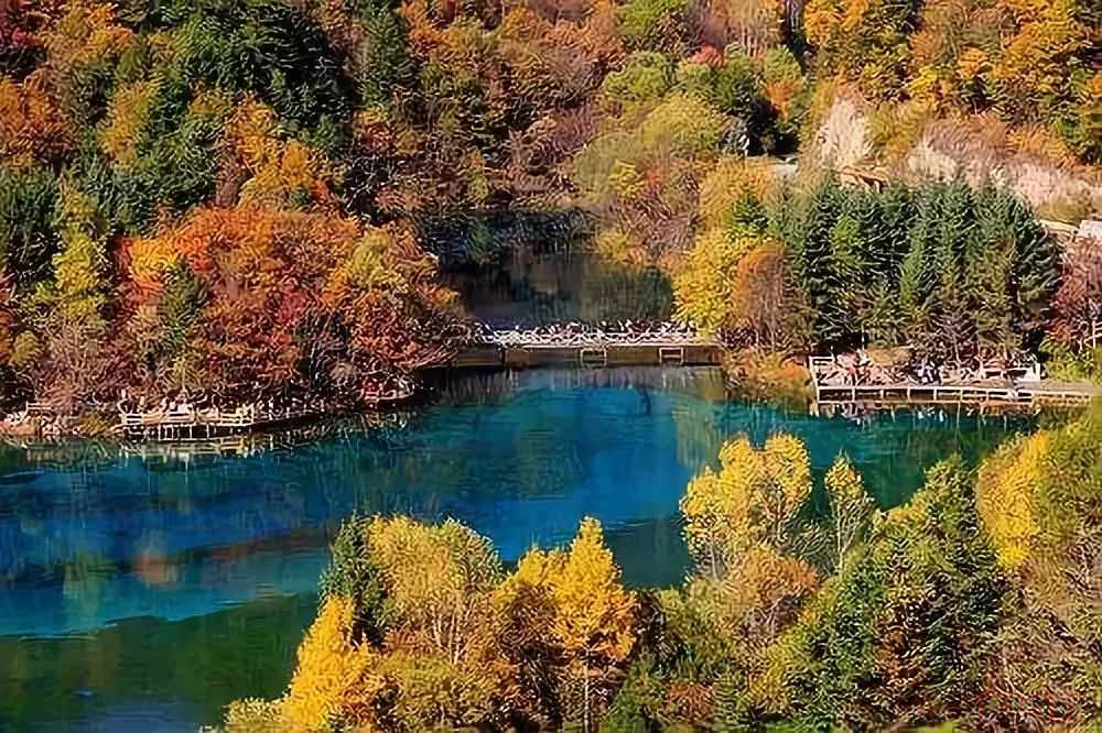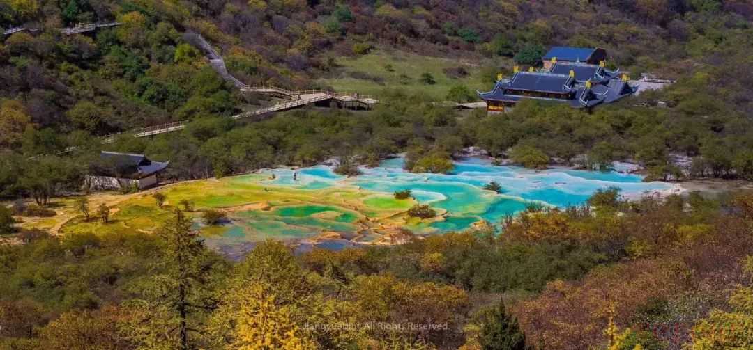 黄龙红叶:让人不得不惊叹大自然的鬼斧神工,漫步池边,无数个大小不等,形状各异的彩池宛如盛满了五颜六色的调色板,蓝绿、海蓝、浅蓝、娇黄等等,艳丽夺目,仿佛仙人撒落在群山之中的翡翠,绚丽奇幻。
