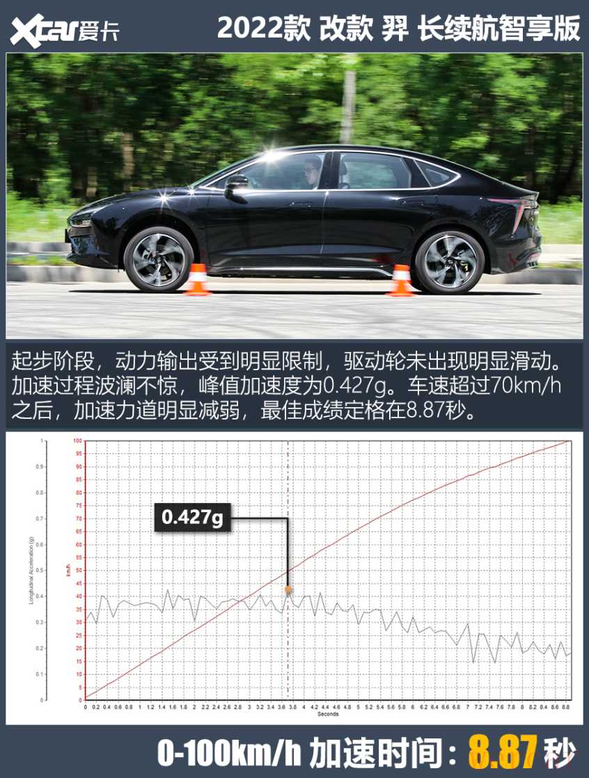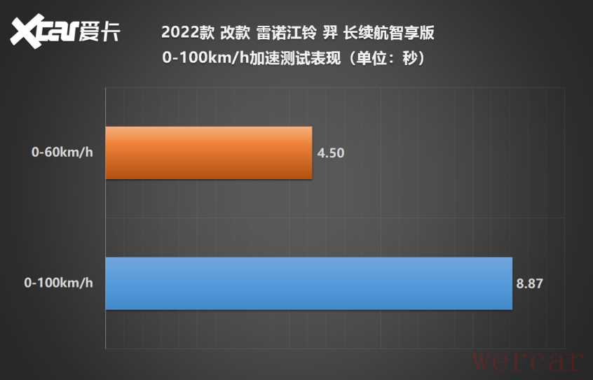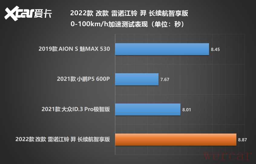 测试车型的车重超过1.5吨(整备质量=1570kg),110kW电机能否轻松驾驭?经过多组测试,雷诺江铃羿长续航智享版的最佳0-100km/h加速成绩为8.87秒,明显优于官方数据(10秒)。在静止加速工况下,车辆存在明显动力限制,加速前半程无法释放全部扭矩。倘若轮胎抓地力再强些,俯仰控制再好些,羿完全有能力跑得更快。