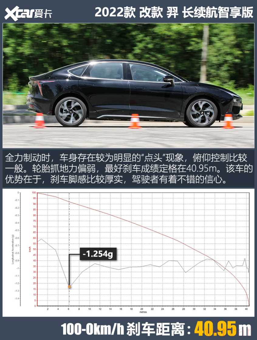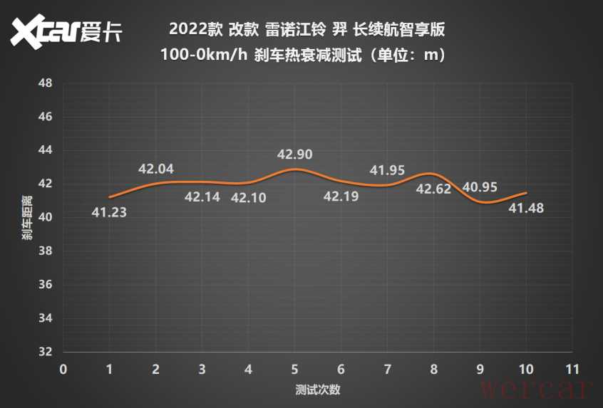 同级横向比较,40.95m的刹车成绩实属一般。幸运的是,羿没有出现明显热衰减。在连续10组测试中,羿的100-0km/h刹车距离基本稳定在41-42m量级。