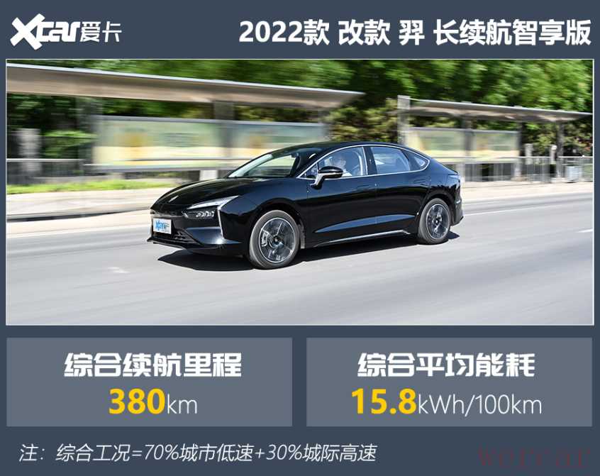 测试车型搭载60kWh三元锂电池,NEDC续航里程为500km。测试时正值夏季,环境温度达到了30℃左右,车内体感闷热。测试期间,我们将空调设定为24℃ AUTO,驾驶模式调至经济,能量回收调至最强。按城市70%、高速30%加权平均,该车的综合平均能耗为15.8kWh/100km。根据60kWh的电池容量计算,羿长续航智享版的综合续航里程为380km,相当于官方标称值的76%。
