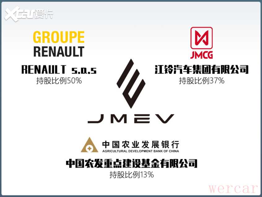 JMEV的发展史要从7年前说起。江铃集团新能源汽车有限公司于2015年正式成立,翌年获得全国第七张纯电动乘用车生产资质牌照。2018年12月,江铃集团新能源与雷诺集团宣布签署电动汽车合作协议。增资扩股后,雷诺集团成为JMEV的最大股东,持有50%股权。与此同时,江铃集团所持股比调整为37%,农发重点建设基金所持股比调整为13%。