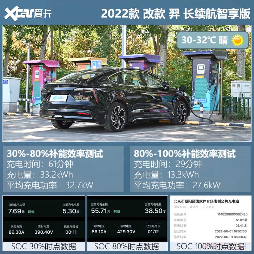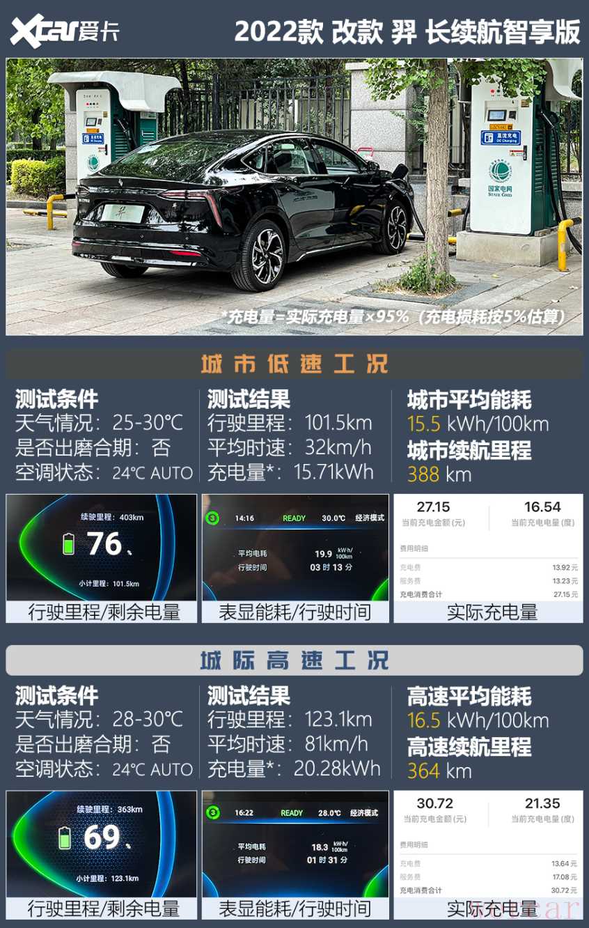 整体来看,羿的城市能耗偏高,高速能耗相对友好。在城市工况下,该车的平均能耗达到了15.5kWh/100km,续航里程为388km。而在高速工况下,能耗水平没有明显提高,平均能耗为16.5kWh/100km,续航里程为364km。需要强调的是,上述成绩仅代表当前天气条件下的表现,不适用于其他季节。