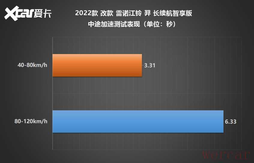 中途加速环节,之前的动力限制不见了,取而代之的是轻微“挠胎”。在40km/h左右深踩加速踏板,前轮出现持续打滑,牵引力明显受限。经过测试,该车的40-80km/h加速时间为3.31秒,80-120km/h加速时间为6.33秒。中后段动力表现略显不足,这是纯电动车的常见特性。