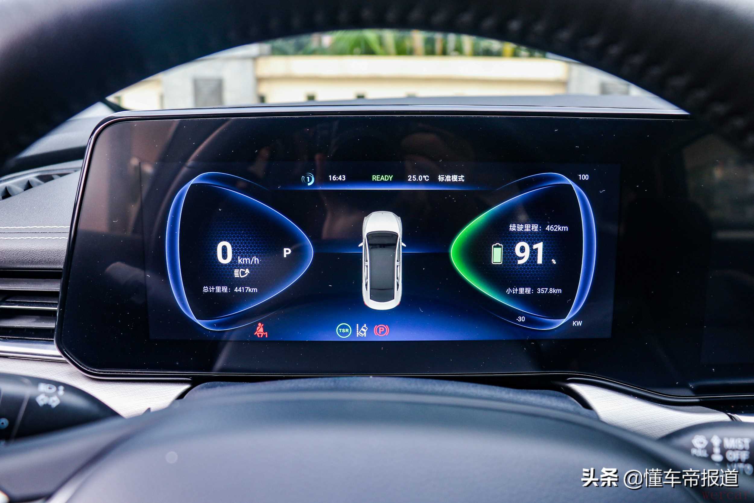 这款车也配备了10.1英寸全液晶仪表和10.25英寸中控屏的双联屏设计,仪表盘可以显示一些常规行车信息,不过个人感觉右侧对于电量百分比的显示比重太大,应该和剩余续航里程信息调换一下位置。毕竟很多用户更愿意去了解更加精确的剩余续航数据,而不是还需要去换算的电量百分比。