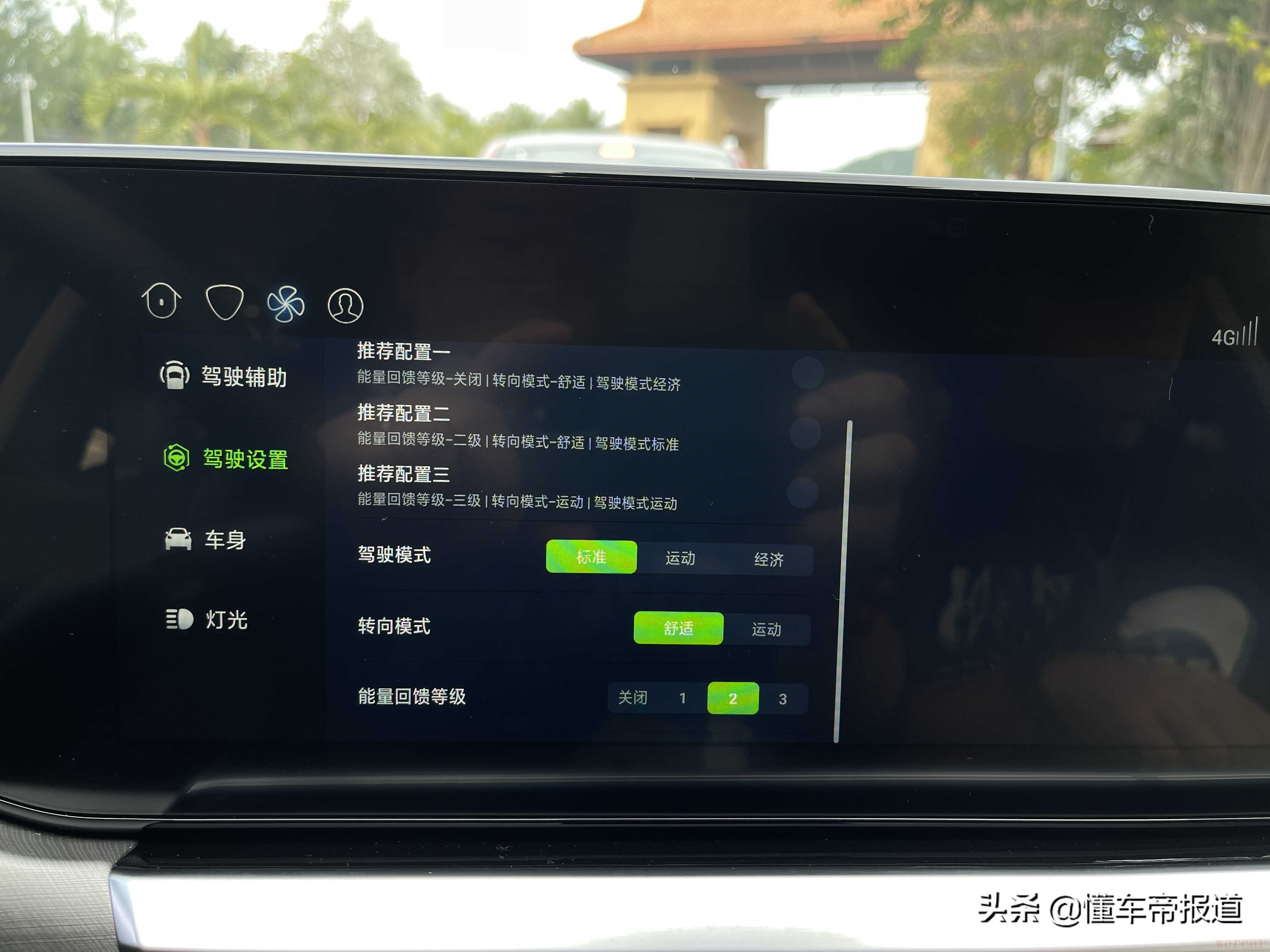 能量回收包含关闭在内一共四档可调,从感知上来说即便使用最强能量回收,松开加速踏板的时候车辆依旧在保持一个正常滑行状态,只能感受到比较轻微的拖拽感,其他几档就不说了,拖拽感只会更不易察觉。这一点其实对于很多没怎么接触过新能源车的用户来说,相对比较友好,毕竟可以继续沿用开燃油车的方式去开这辆车,而不用再去重新学习电动车应该怎么开。