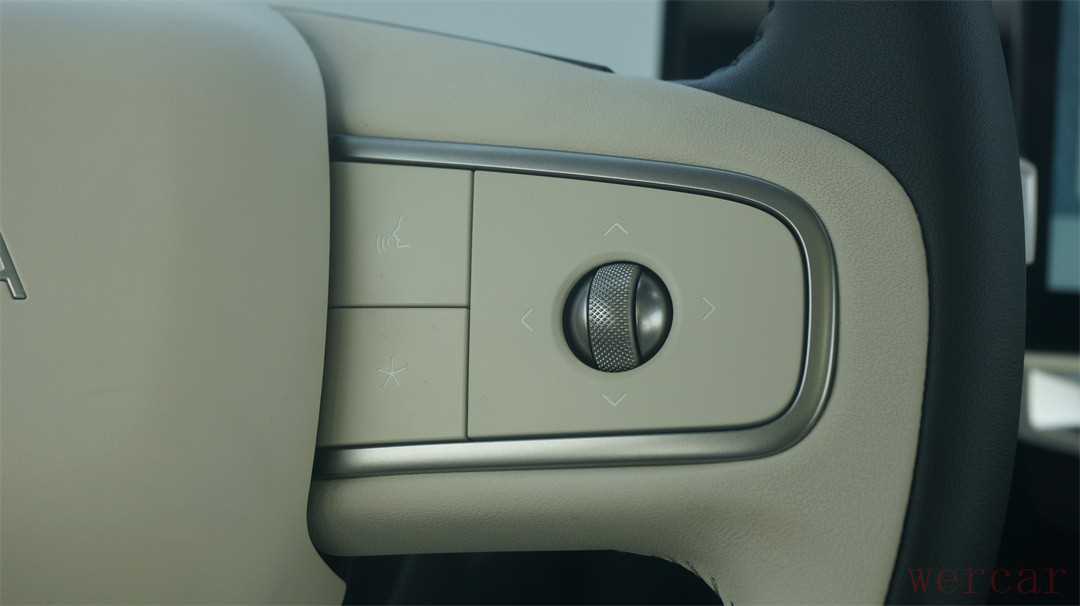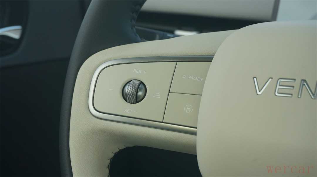 方向盘采用了双幅式的造型,两侧盘幅略宽,握感会更好。方向盘左侧的操作区域主要为巡航按键,以及运动模式的切换键;而右侧则是多媒体、语音和自定义按键,符合大多数人的使用习惯。