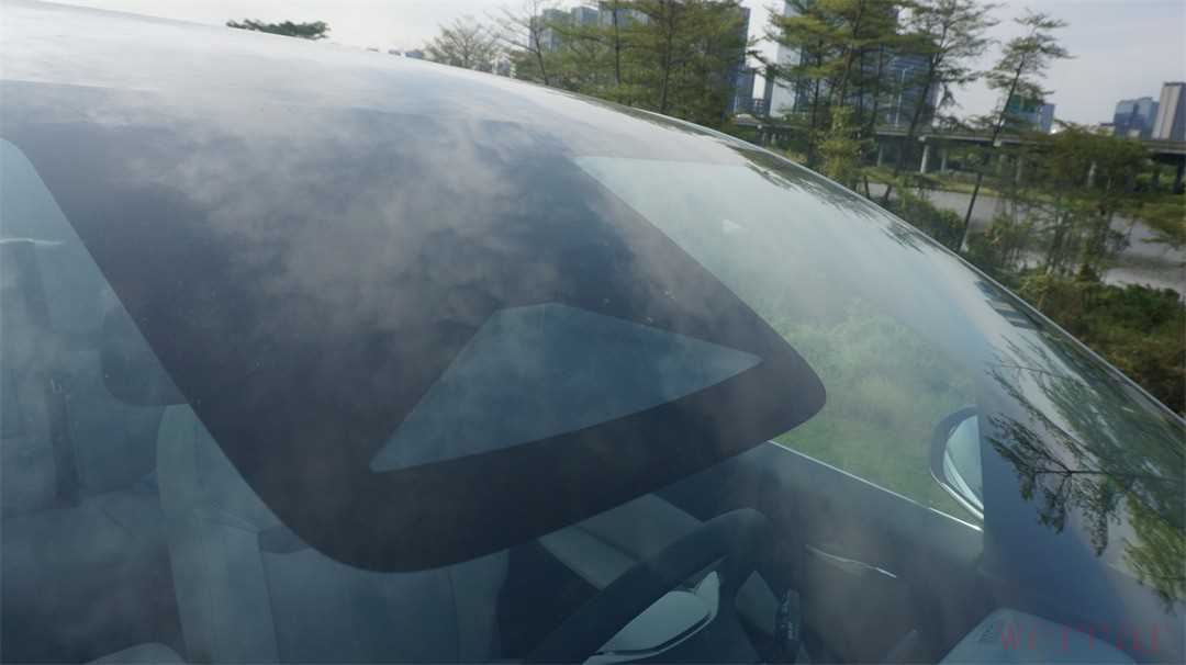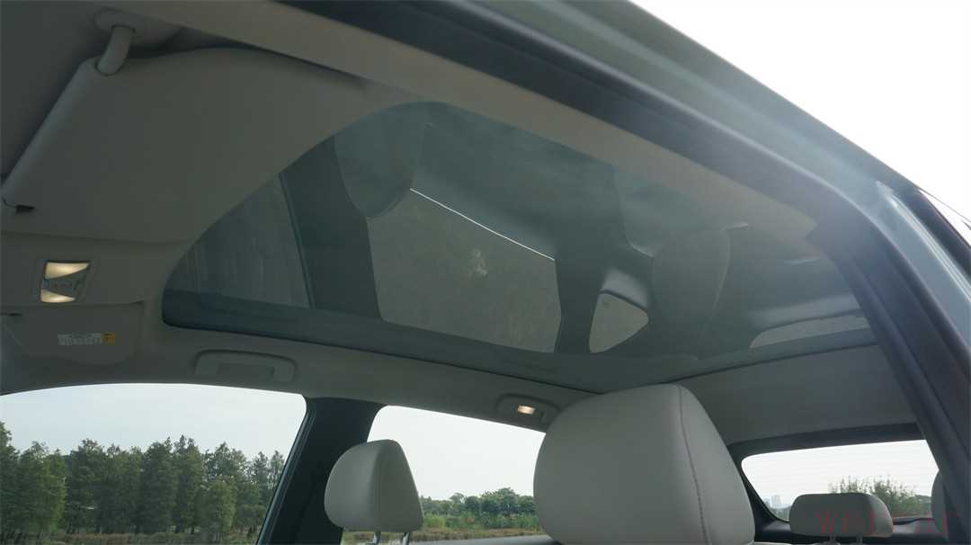 车顶采用了不可开启的大面积全景天幕,白天的视野非常通透,比较可惜的是没有电动遮阳帘,只能通过官方提供的手动遮阳帘,自行安装来进行遮蔽;而且对于阳光的隔绝能力也比较一般。另外,两侧的车窗也没有配备隐私玻璃。