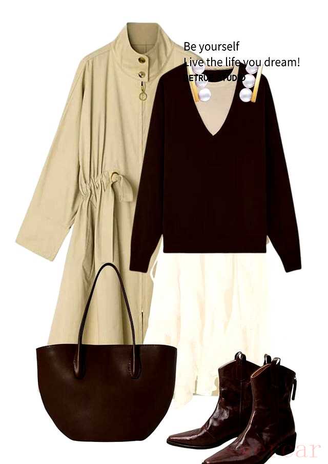 深棕针织用三十二支羊毛包芯纱,垂坠不皱,地铁里挤一小时也不显邋遢;纱裙用五十D雪纺带防静电,坐下不起包,会议室里不尴尬;卡其风衣面料加了三氨纶,够挺括也能卷起来塞包里,下午三点去茶馆,展开就能拍氛围照。