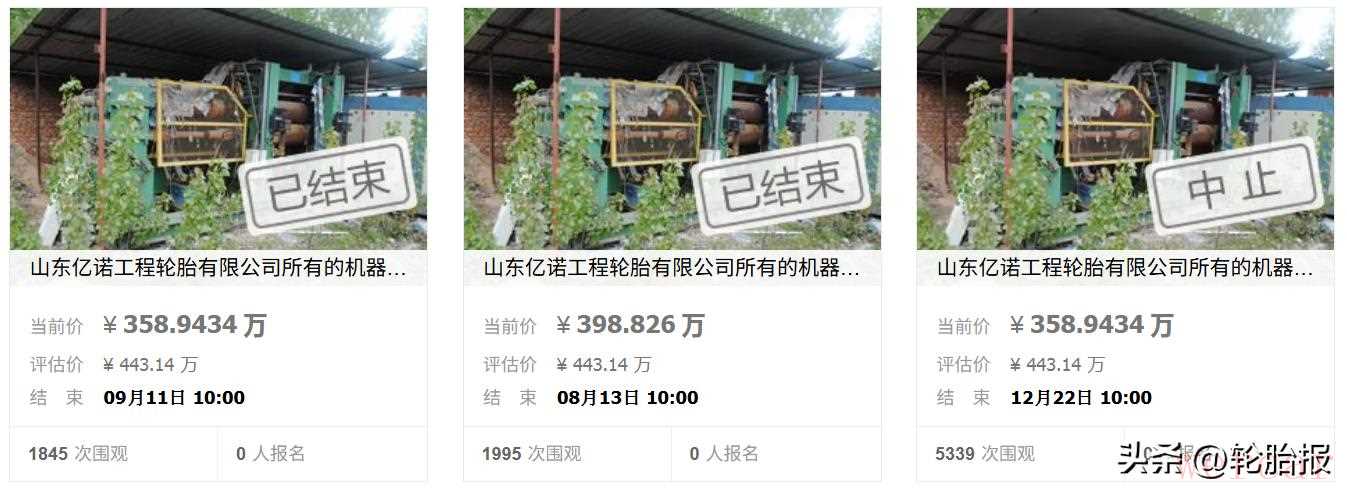 无独有偶,曾因17亿元巨额投资而备受瞩目的山东亿诺工程轮胎有限公司,其土地、厂房等资产也于8月26日在枣庄滕州流拍,起拍价约1.94亿元。而其机器设备在2020年8月、9月、12月已进行过三次拍卖,均无人出价。