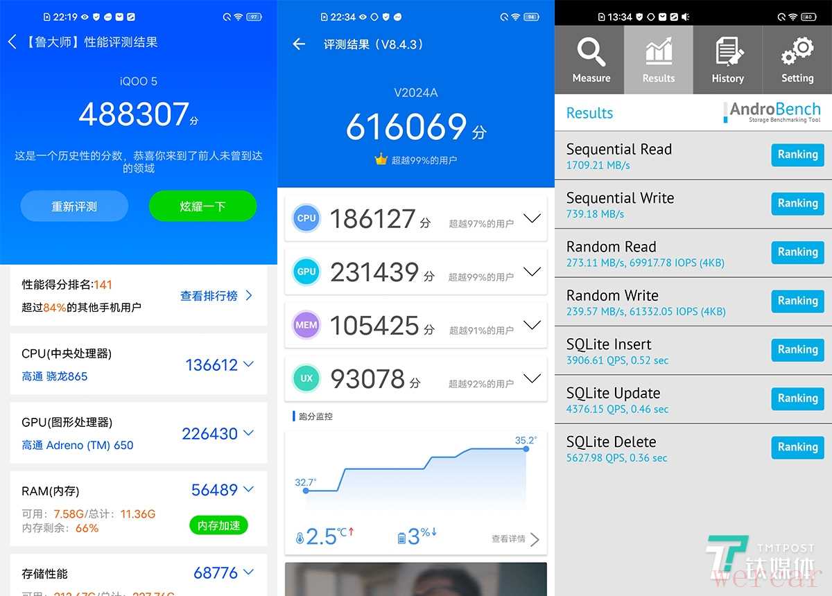 跑个安兔兔和鲁大师看下得分,从性能测试上来看,都已经是登顶的级别,毫无疑问,iQOO5已经提供了最顶级的配置给玩家了。特别是UFS3.1 超快闪存的搭载,加快了内部读取速度,玩游戏不等待,也为5G时代高下载做好了准备,让手机本身不会成为瓶颈。