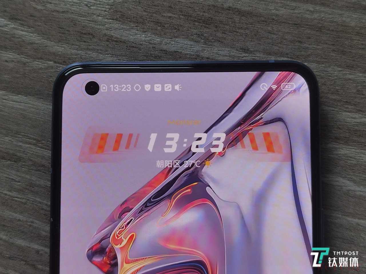 iQOO 5的屏幕左右边框为1.65mm、下边框仅为2.8mm,微缝听筒部件更是几乎无法察觉,只有0.3mm的宽度,自拍摄像头位于屏幕左上方,这样的设计带来了更好的全面屏体验。