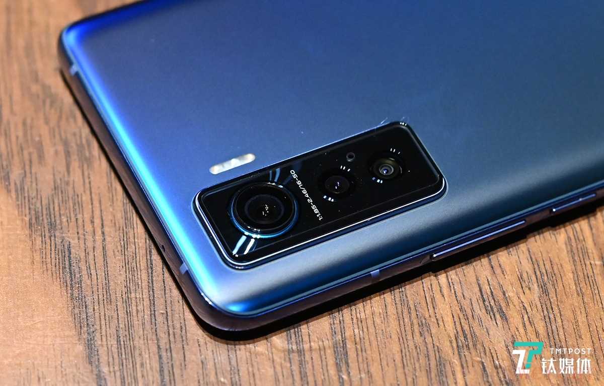 背面的三摄摄像头采用竖排列,这也是目前业内比较主流的排列方式。摄像头相比机身有一定的突起,采用了从大到小依次向下的渐进式排列布局,主摄外面设计了一圈蓝色边框,强调了这次在摄影功能上的提升。