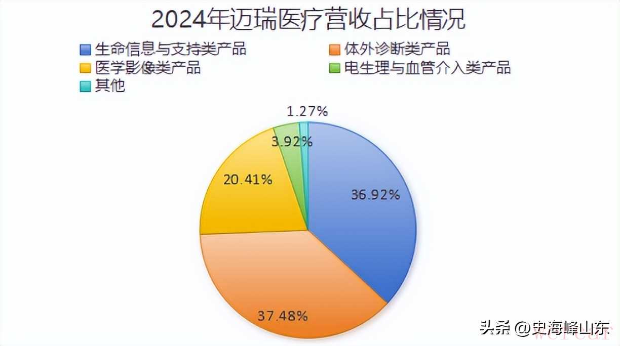 当然,数智化不是一句空洞的口号,它需要有强大的产品力作为坚实基础。迈瑞医疗作为全球领先的医疗器械厂商,拥有国内同行业中最全的产品线。其产品涵盖了生命信息与支持、体外诊断、医学影像等多个领域。2024年,公司生命信息与支持、体外诊断、医学影像类产品营收占比分别为36.92%、37.48%、20.41%。这一数据充分显示了迈瑞医疗在各个领域的均衡发展和强大实力。