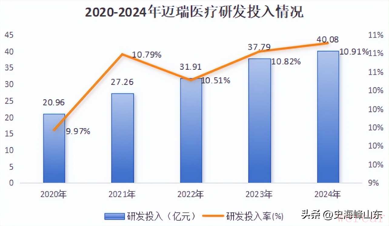而这一切的背后,离不开迈瑞医疗对于研发的持续投入。2020 - 2024年,公司的研发投入从20.96亿元增至40.08亿元,几乎实现了翻倍增长。同期,公司研发投入率也从9.97%攀升至10.91%。研发投入的不断增加,为公司的技术创新提供了坚实的资金保障。