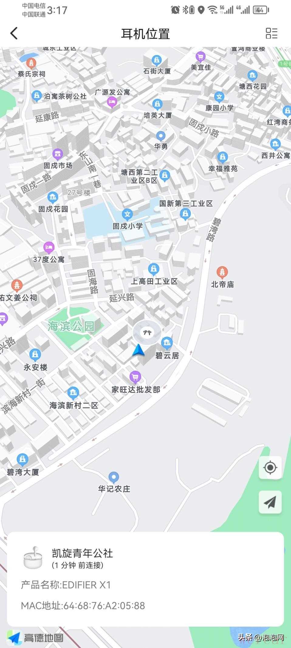 通过快速指南的二维码链接,我们下载好漫步者X1专属APP,在“我的——耳机位置”中,就可以轻松看到最后一次耳机的位置。这个功能十分适用于不慎遗失在外且耳机未连接的场景,我实际测试了一下,发现最终定位的精度非常高。这样一来,即便耳机遗失在外面,也有找回的可能。