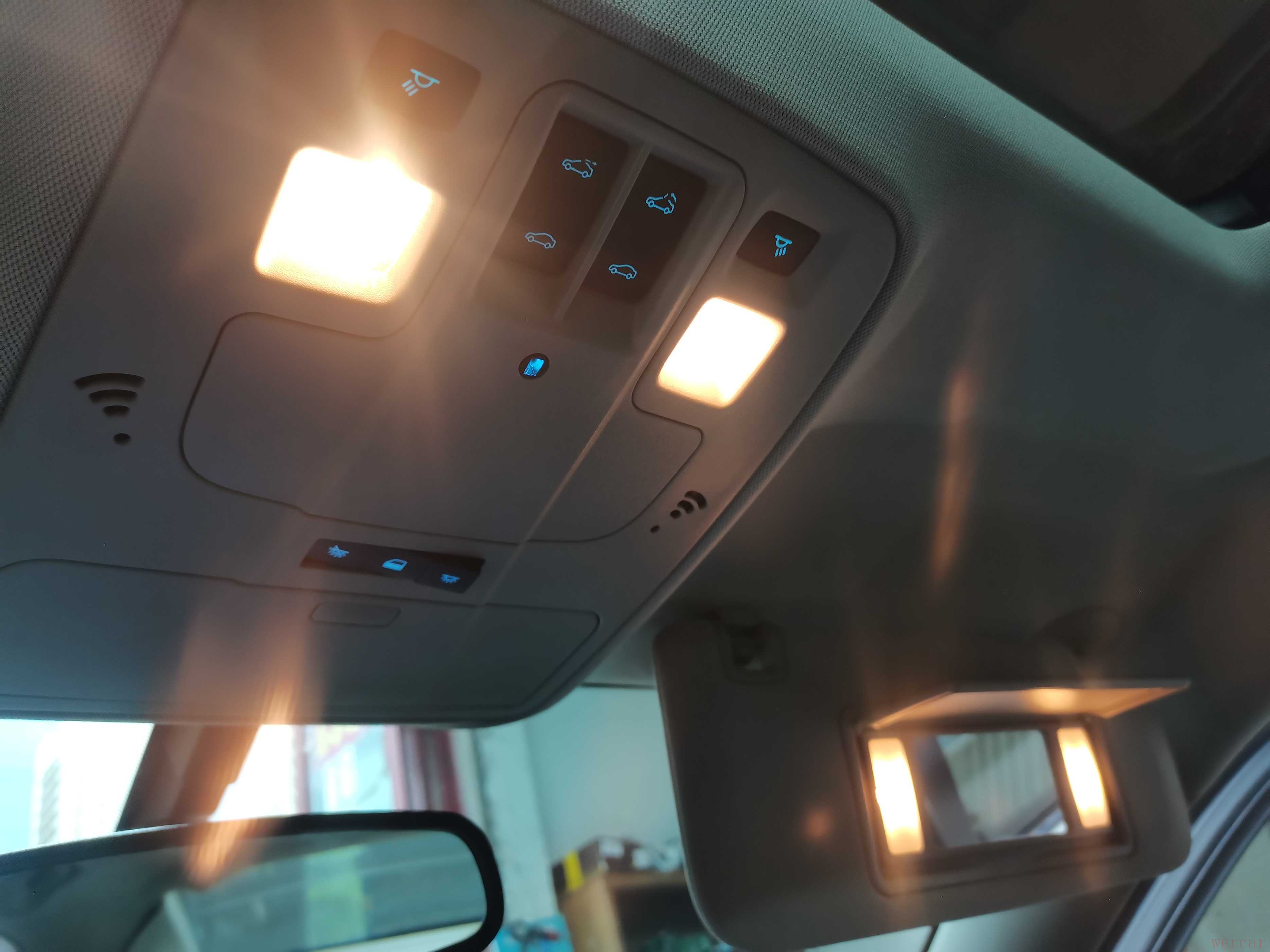 前排顶部遮阳板化妆镜自带补光灯,除了地图灯外还有一个冰蓝色的小射灯,夜间看起来还是挺有趣的。