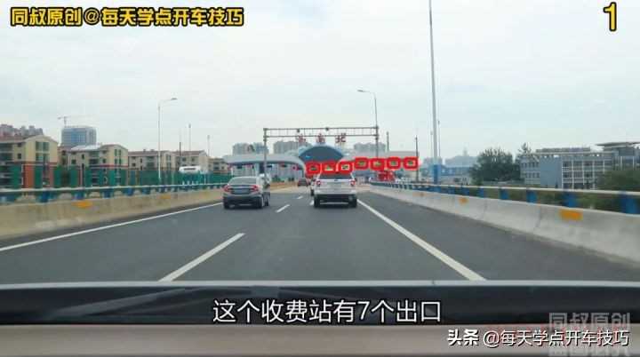 前方即将到达高速公路的出口收费站,通过出口通道的绿色LED屏可以判断,这个收费站有7个出口,