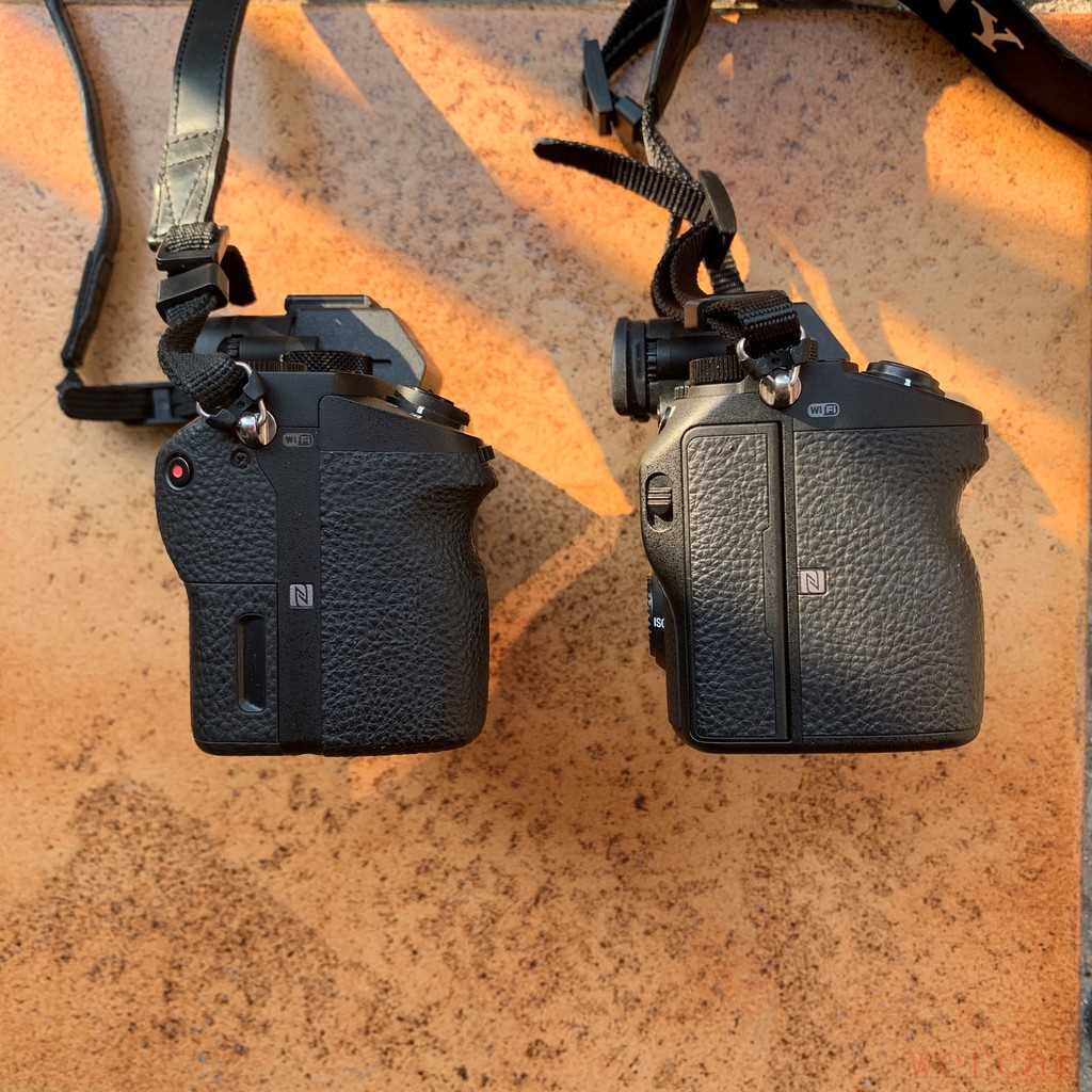 #索尼大法好# 另一个重要的改进就是手柄的握持感。相比前代产品,索尼A7m3手柄的宽度,以及指槽的深度,都有明显的改变。我使用索尼A7m2时,总喜欢给它加一个“皮套”,以增加手柄的厚度,来增强握持感。但在使用索尼A7m3时,原生的手柄已经给我很好的感觉,拿在手上掌心和机器之间没有很大的缝隙,不会有“空空”的感觉,这感觉对于手掌较大的男摄影师实在是个福音。下图为索尼A7m2(左边)和索尼A7m3(右边),手柄部分的比对图。