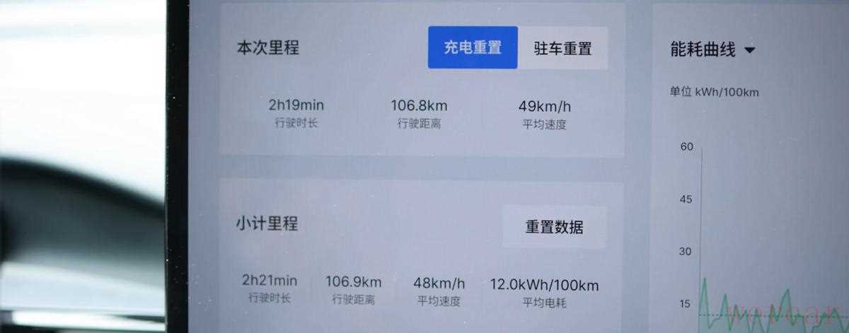 对于纯电车型,大家最关心的当然是续航问题。我们小测了一次,在空调温度22度,风速4档,乘坐3个成年人,切换为节能模式,并将平均车速保持在49km/h的情况下,实际距离行驶了106.8km,而表显掉电里程为118km。