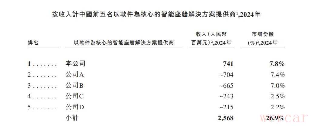 根据灼识咨询的资料,按2024年收入计算,斑马智行是中国最大的以软件为核心的智能座舱解决方案供应商,同时根据同一资料来源,按解决方案搭载量计算亦排名第一。