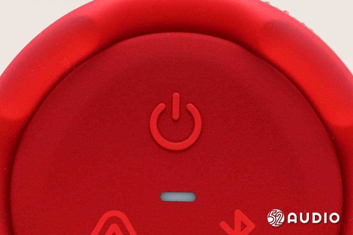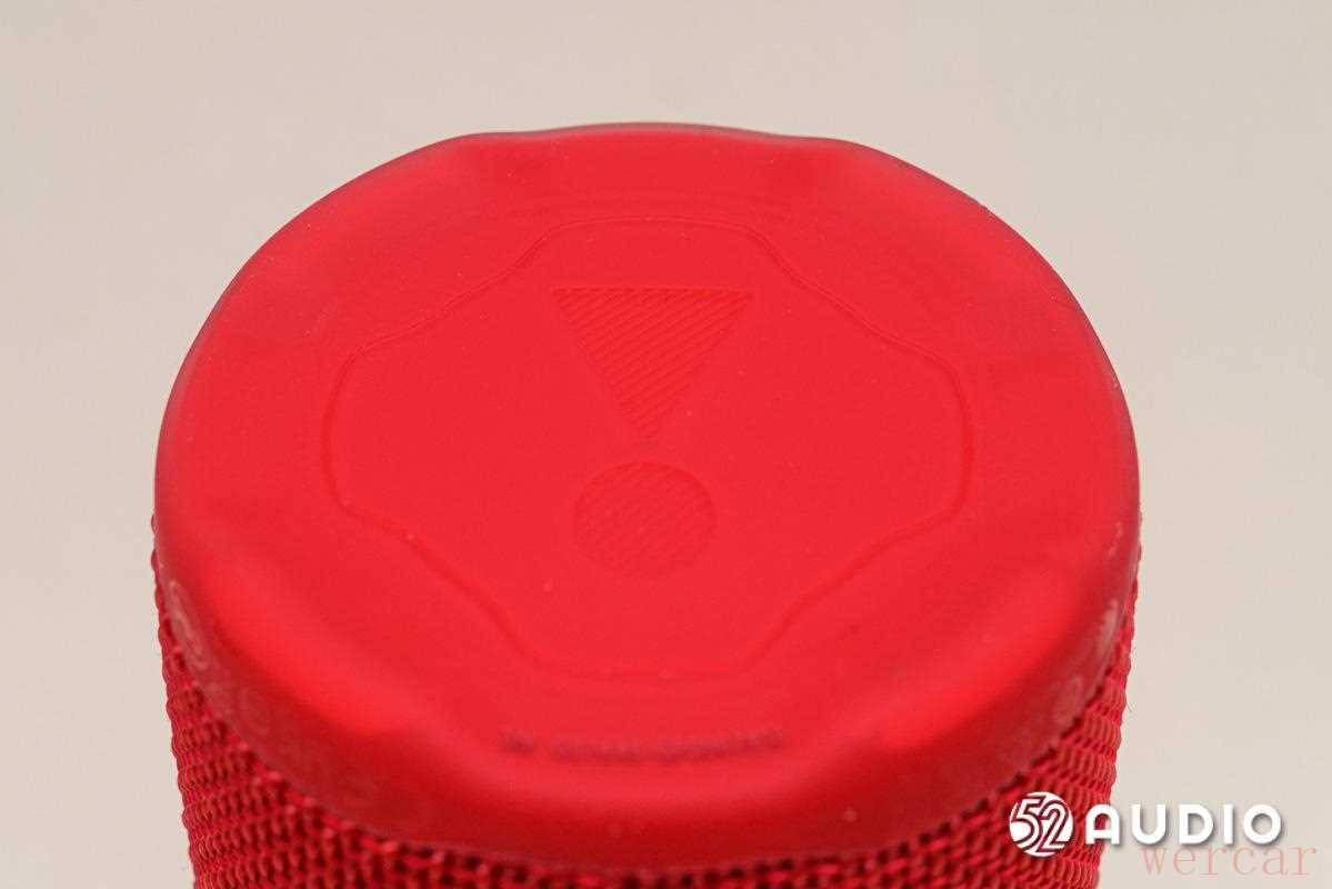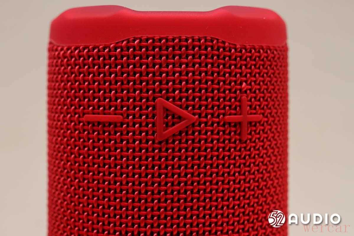 取出音箱,在未开机的状态下,音箱外观如上。「石榴红」版本的 JBL GRIP 霓虹罐整体呈朱红色,是一种「红中有橙」的活力朱红,整体十分吸睛。音箱整体呈高圆柱状,在形态上与「高罐易拉罐」很相像,正面凸起部分设有 JBL 标志、播放/暂停按钮和音量控制按钮。