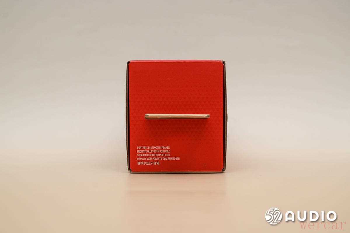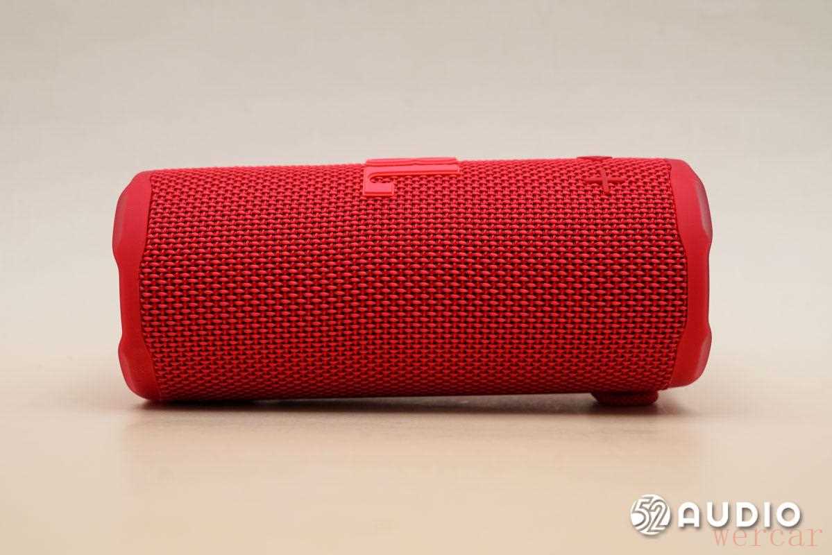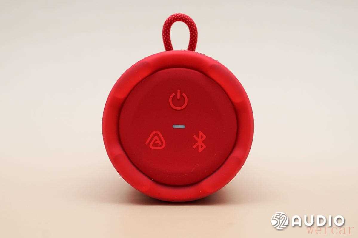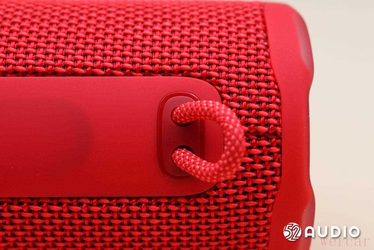 取出音箱,在未开机的状态下,音箱外观如上。「石榴红」版本的 JBL GRIP 霓虹罐整体呈朱红色,是一种「红中有橙」的活力朱红,整体十分吸睛。音箱整体呈高圆柱状,在形态上与「高罐易拉罐」很相像,正面凸起部分设有 JBL 标志、播放/暂停按钮和音量控制按钮。