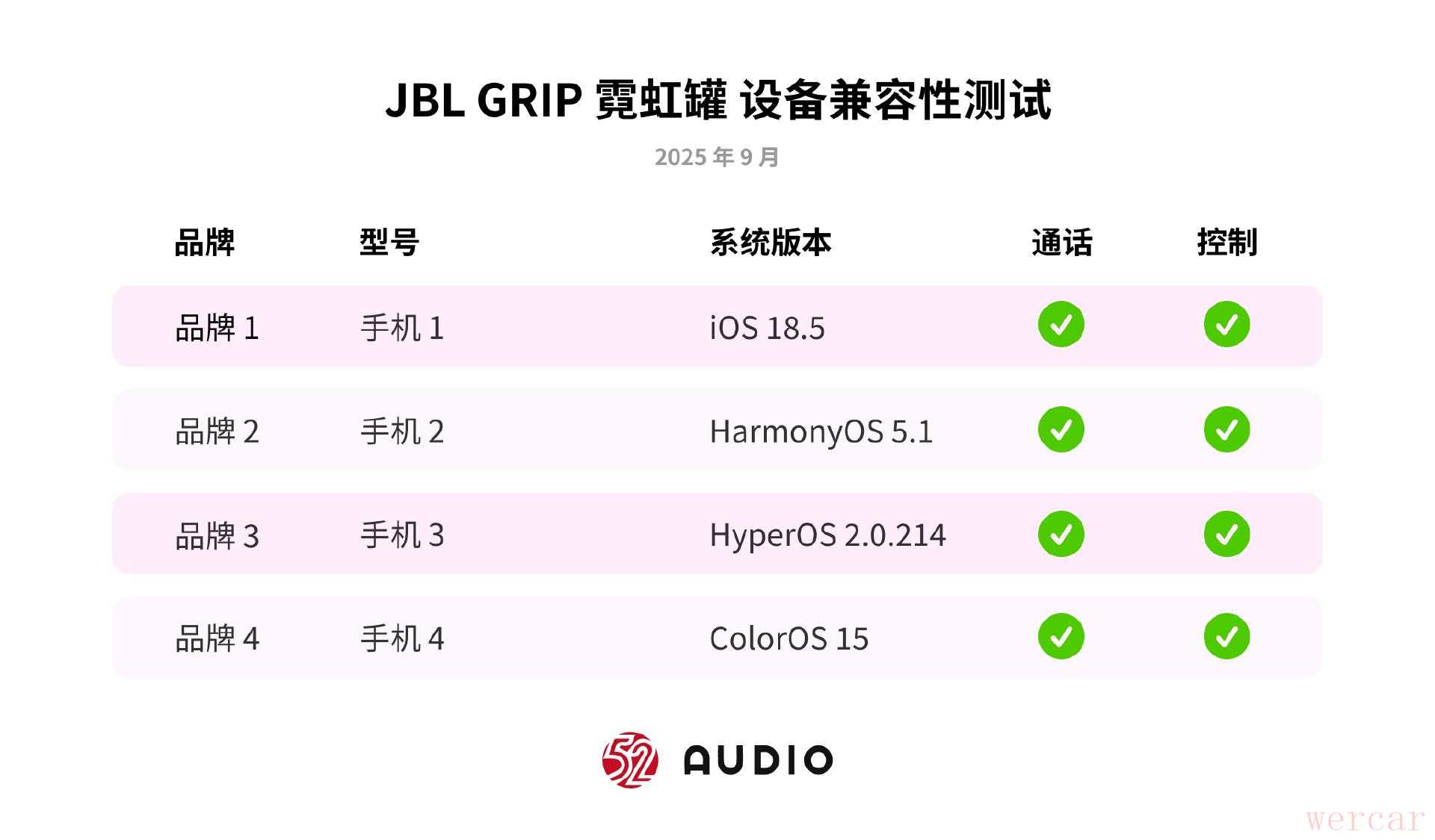 JBL GRIP 霓虹罐使用最新蓝牙协议,为测试音箱与主流设备之间的兼容性,我们选取目前 4 款流行的移动设备,对其进行设备兼容性测试。