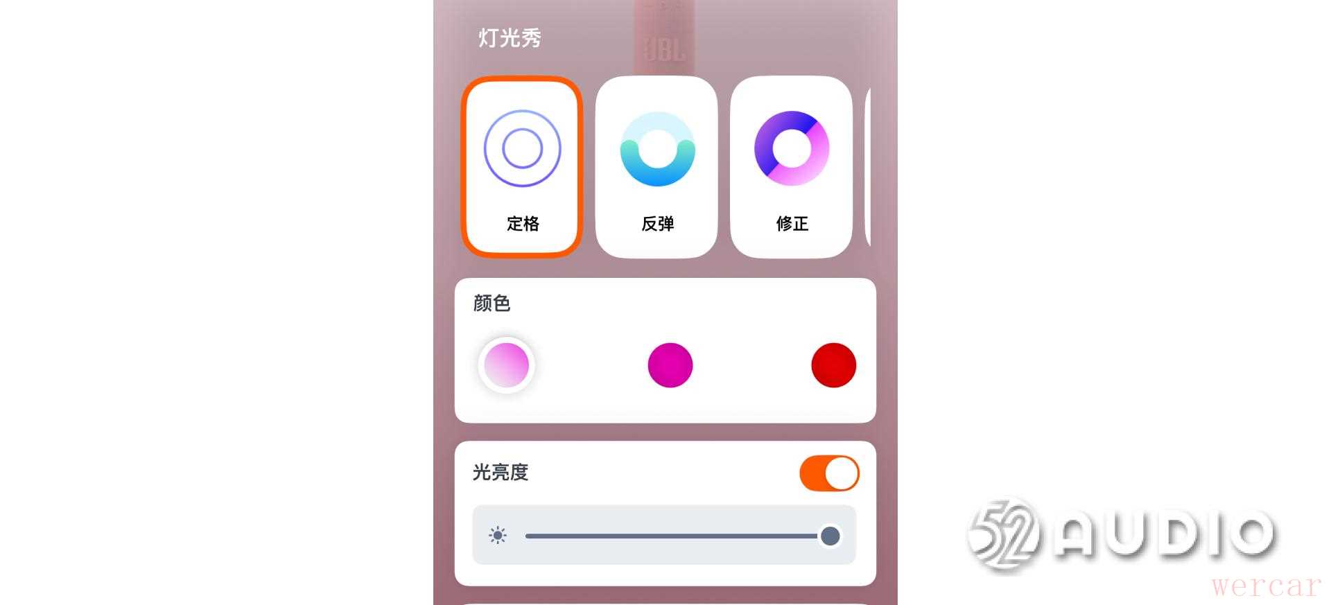 音箱灯效提供「定格」「反弹」「修正」「切换」「霓虹」共五种模式。可通过灯区旁边的实体按钮或App 进行切换。