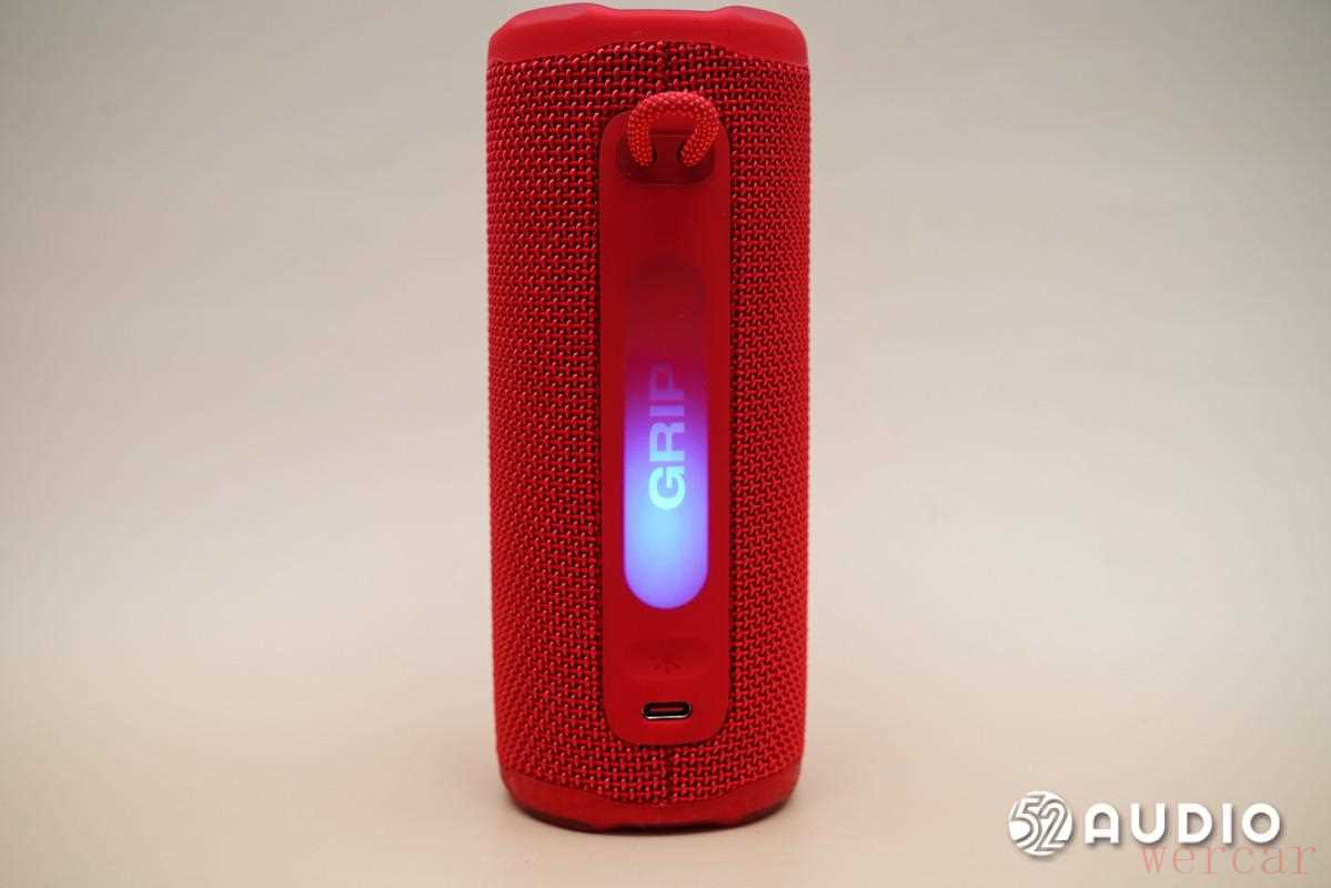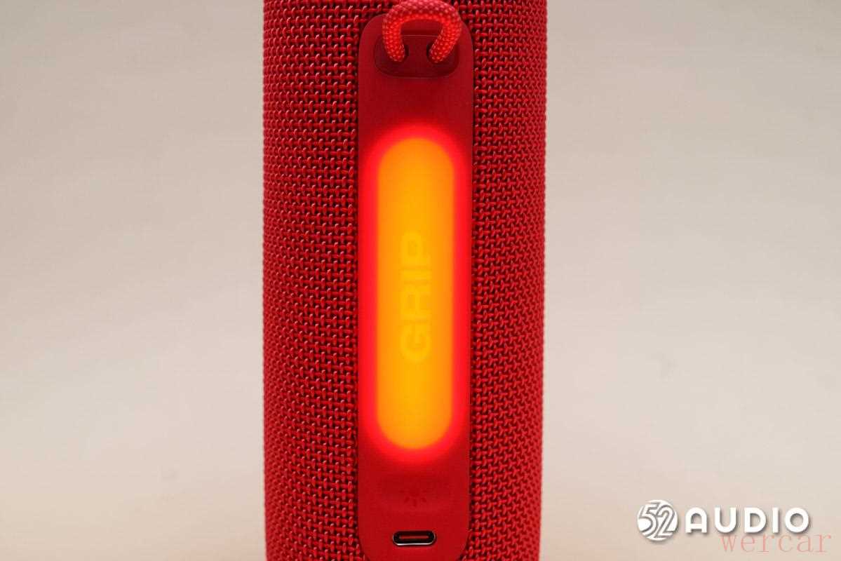 JBL GRIP 霓虹罐音箱的灯区位于提手带与 USB-C 充电口之间的位置,与外壳融为一体。JBL GRIP 霓虹罐的灯区整体大小适中,作为「视觉窗口」,起到了锦上添花、增强氛围的作用。
