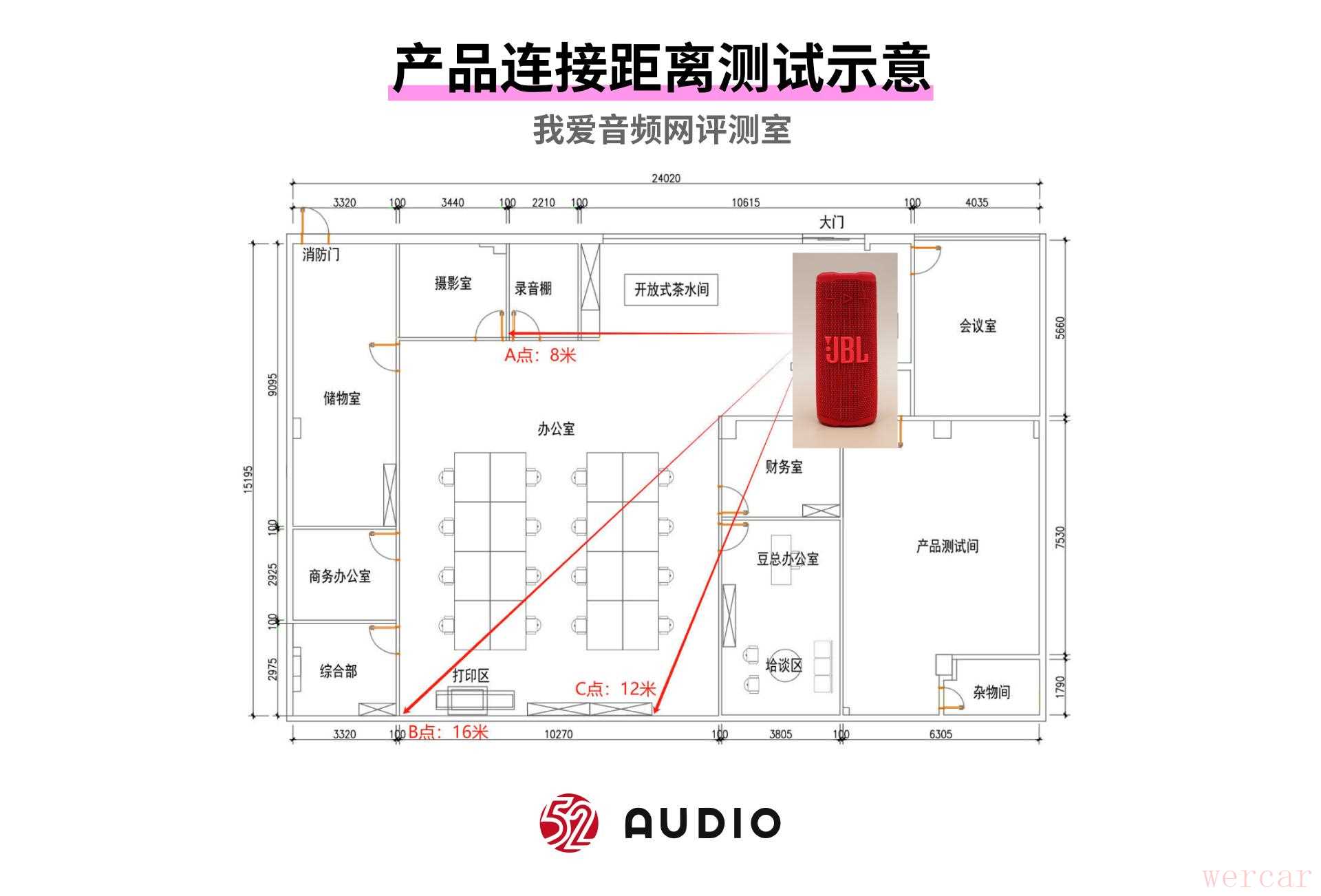 我们将 JBL GRIP 霓虹罐与一部手机 连接,并将手机固定在我爱音频网编辑部前台,佩戴耳机分别走到 A、B、C 三点,以此测试耳机的连接稳定性和抗干扰性能。其中: