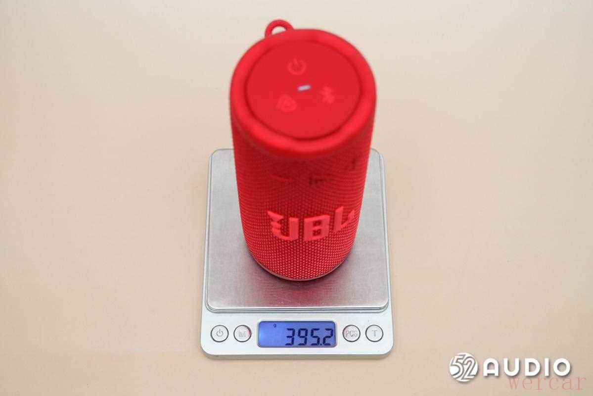 我爱音频网使用高精度秤对 JBL GRIP 霓虹罐测重,JBL GRIP 霓虹罐音箱总重量为 395.2g,和一罐易拉罐汽水(约 350g)的重量相近。