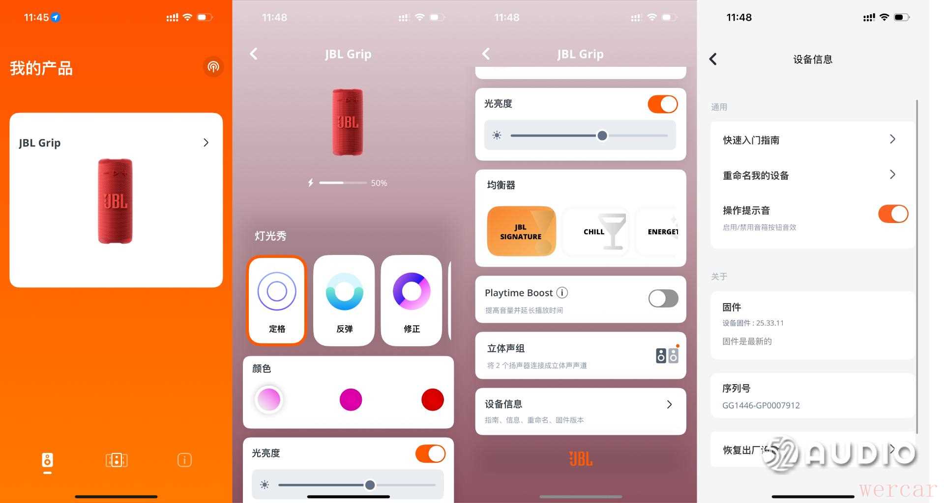 其后,手机安装「JBL Portable」官方App后可自动识别JBL GRIP 霓虹罐音箱设备。 App 功能包括电量显示、固件更新、灯光效果调节、内置 EQ 均衡器、Playtime Boost 时续航时间延长等。
