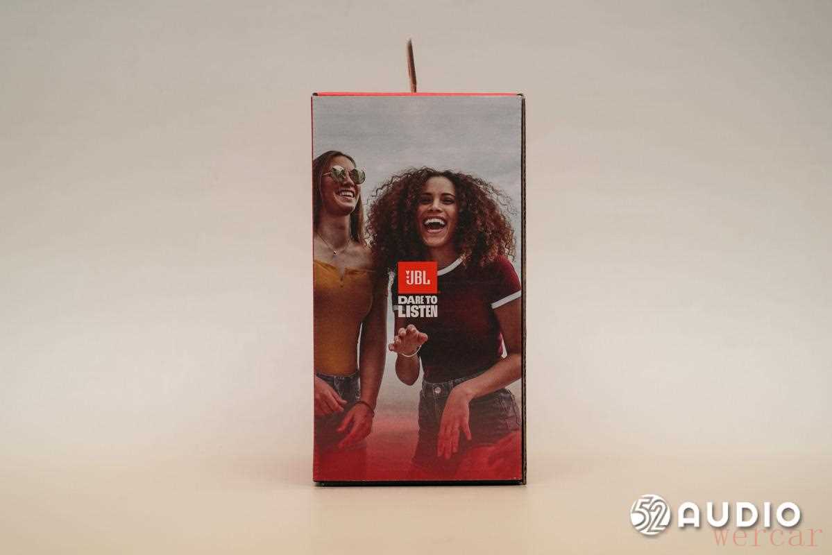 左侧面绘有音箱的使用场景图,以及 JBL 的标志和 Slogan「Dare to Listen」。