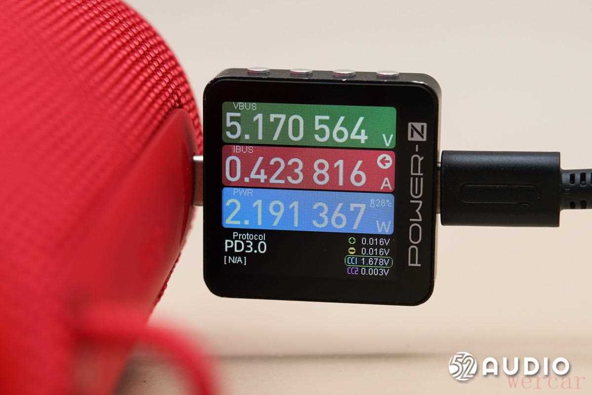 我爱音频网采用 CHARGERLAB POWER-Z 专业测试仪测试 JBL GRIP 霓虹罐的充电性能。测试测得,JBL GRIP 霓虹罐的充电功率为 2.2W,支持 PD 3.0 充电协议,从电量耗尽到充电完成需 3 小时。在平时使用时,也可将它作为桌面音箱或「氛围灯」,持续接入电源。