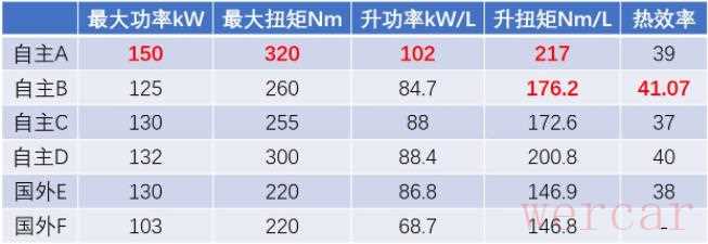 2.东风风神C15TDR。如下图所示,我找了如今市面上主流的几款1.5T的发动机机型,其中前四款是自主品牌,后面两款是国外品牌,一个是日系,一个是德系。我自上而下给它们做了一个综合排序,在升功率、升扭矩和热效率这三块数据中,靠前的两个机型是是自主A和B。自主A升功率破百,达到了102kW/L,升扭矩达到了217Nm/L,热效率达到了39%。自主B热效率高达41.07%!需要大家注意的是,这里的升功率“破百”并不是指马力破百,而是指功率破百,这一数据已经基本吊打所有同级别的发动机了。